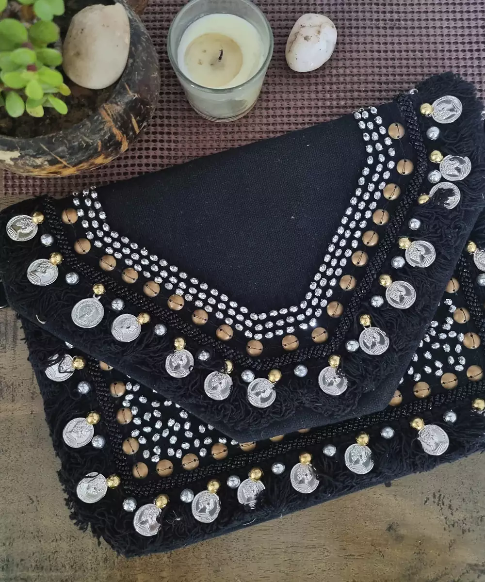 Canvas Clutch Bag Embellished With Beads,Coins& Tassels. Comes With A Long Sling Chain