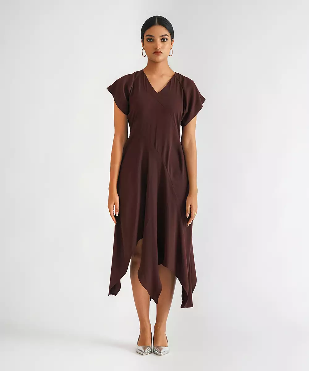 Flare Sleeves,Diagonal Stylelines With Draped Bottom,Asymmetric Hem,Functional Pockets,V Neckline Colour : Wine Fabric : Crepe Components : 1 ( Dress) Work : Plain