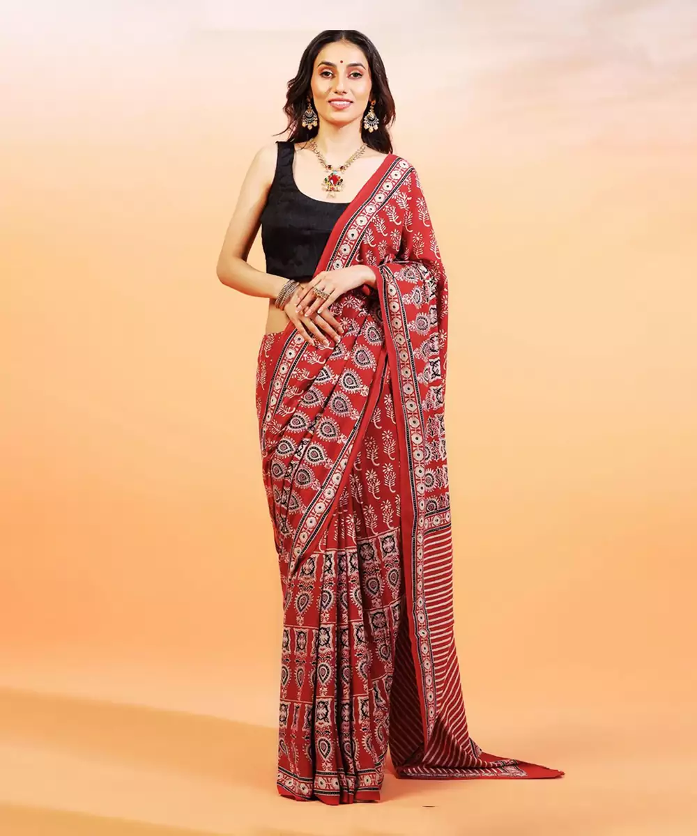 Hand Block Print Ajrakh On Cotton, Ethnic Motifs, Uses Vegetable Dyes