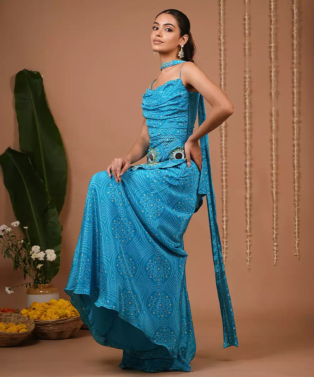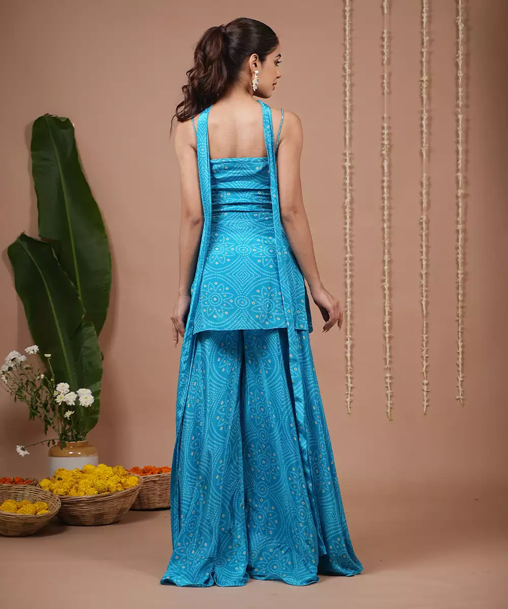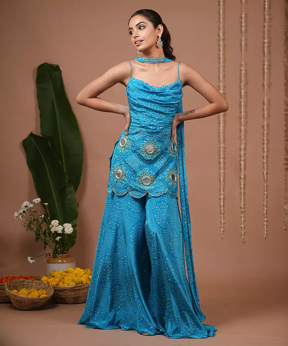 Cowl Draped Torso With Spaghetti Straps.Extended Tunic Like Overlay With Scalloped Hemline.Large Mirror Embroidery Motifs Across The Front.Wide Leg Flared Palazzo Pants In Matching Fabric/Print.Hand Mirror Work (Shisha) Placed In Geometric Floral Pattern.Golden Thread/ Zari Highlights Around Mirrors.Subtle Bandhani Style Print Motifs Across The Fabric.Side Zip Closure.Palazzo Length: 42,Model Size: Model Is Wearing Xxs Size , Model Height: 5’7”
