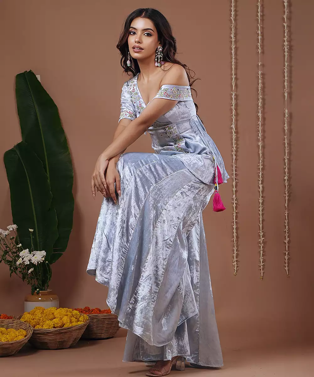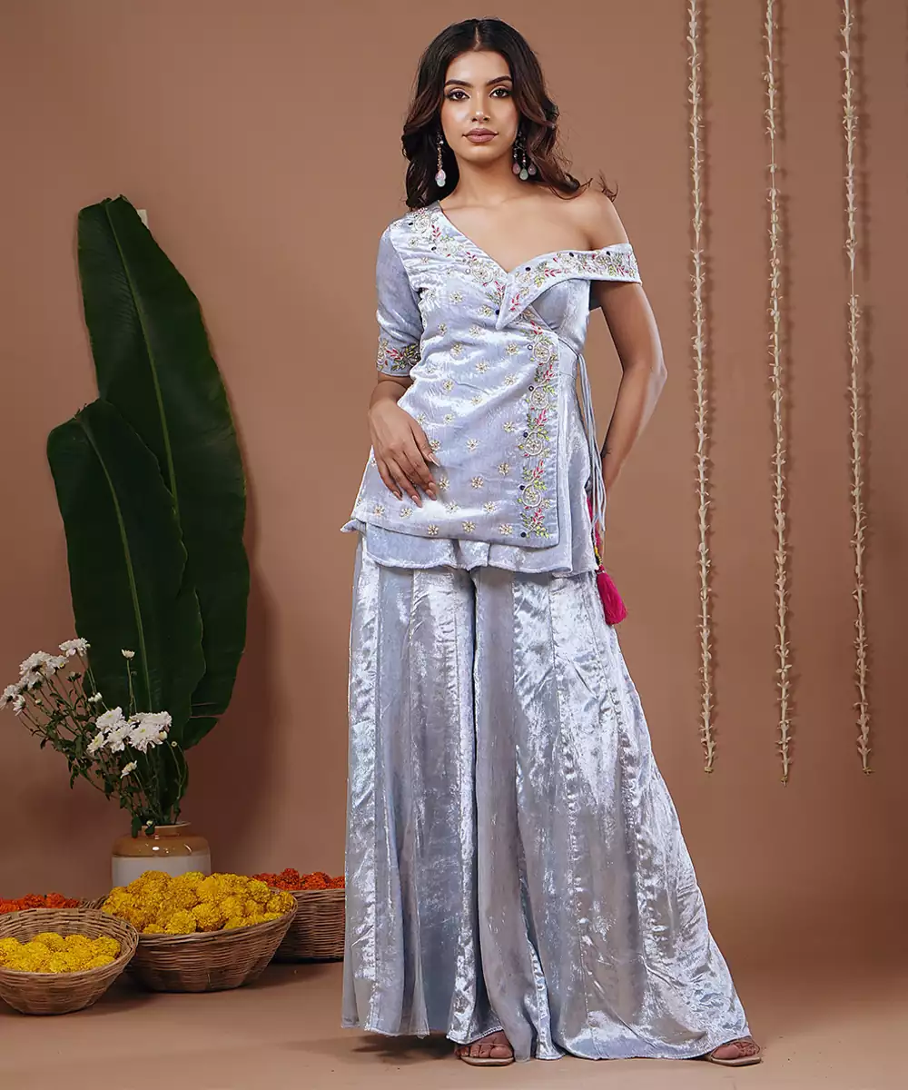Asymmetrical Off Shoulder Tunic With A Peplum Style Flare. Off Shoulder Sweetheart Neckline With Floral Embroidery On The Neckline Band.Delicate Floral Thread Embroidery In Pastel Hues (Peach, Green, Ivory) Along Neckline And Bodice.Small Mirror Work Accents Adding Subtle Shine.Flared Kali Palazzo Pants With A Flowy, Skirt Like Appearance.Jacket Length: 27 " , Palazzo Length: 42 " ,Model Size: Model Is Wearing Xxs Size , Model Height: 5’7”