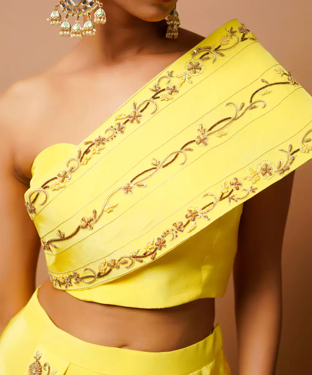 This Set Comes With A Padded Bustier And Palazzo. High Waist Flared Palazzo With Attached Kali Has The Handwork Of A Zardosi,Moti,Sequence,Thread And Zari. One Shoulder Kali Pattern Bustier Is Padded And Has Handwork Of Zardosi,Moti,Sequence,Thread And Zari. .