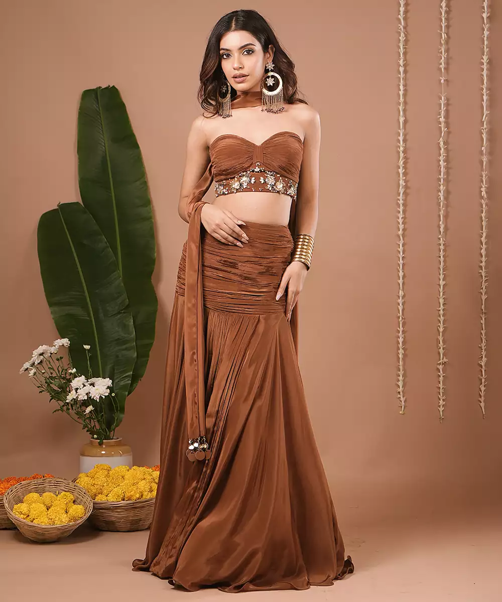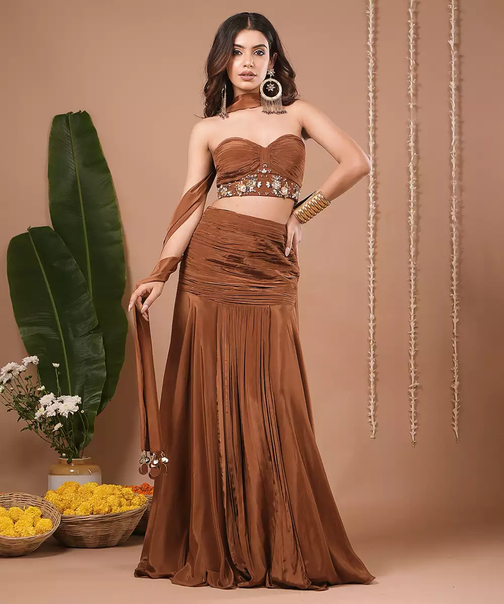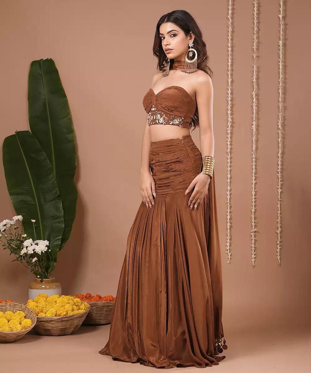A Two Piece Set Consisting Of A Strapless Bustier/Crop Top And A High Waisted Flared Skirt.The Bustier Is Structured With A Sweetheart Neckline And Featured Sequin, Moti,Embroidery Across The Bust Line.Skirt Is Floor Length ,Flowy,And Made With Ruched Pleats Detailing At The Waist For A Flattering Silhouette.Scarf Embellished With Fabric Hanging.Side Zip Closure.Corset Length : 13 " , Skirt Length: 44 " , Model Height: 5’7” , Model Is Wearing Xxs Size