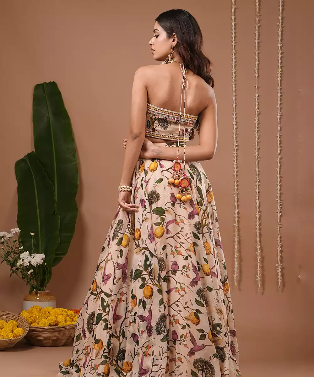 Strapless, Sweetheart Neckline With A Fitted Bustier Silhouette.Yellow Piping And Bead/Sequence Embroidery Highlight The Neckline And Hemline. The Lehenga Is Floor Length, Flared Silhouette With Soft Gathers.High Waist Cut For Elongation Lightweight Drape With Flowy Fall.Heavy Statement Choker With Vertical Pearl Strand Drop At Center, Complementing Strapless Neckline