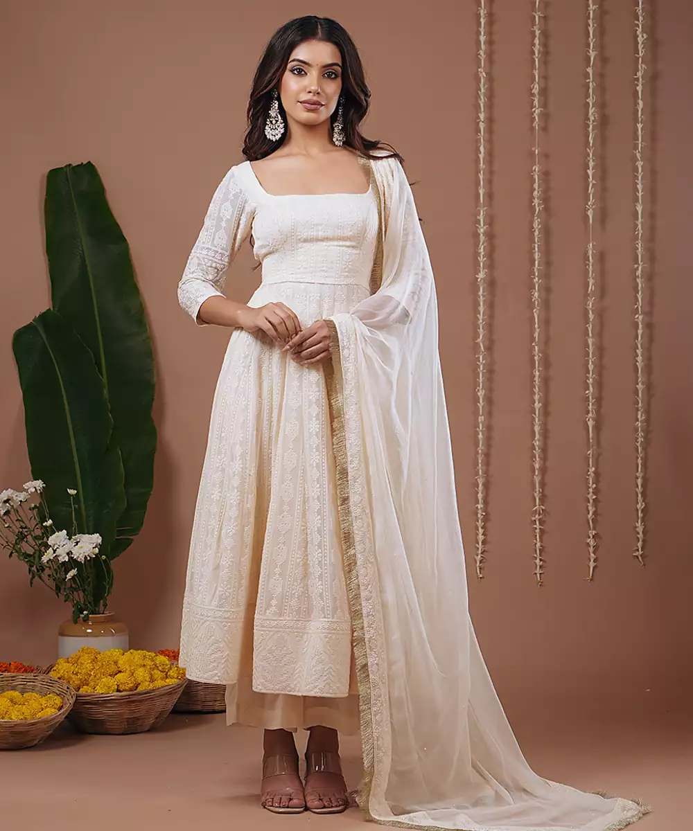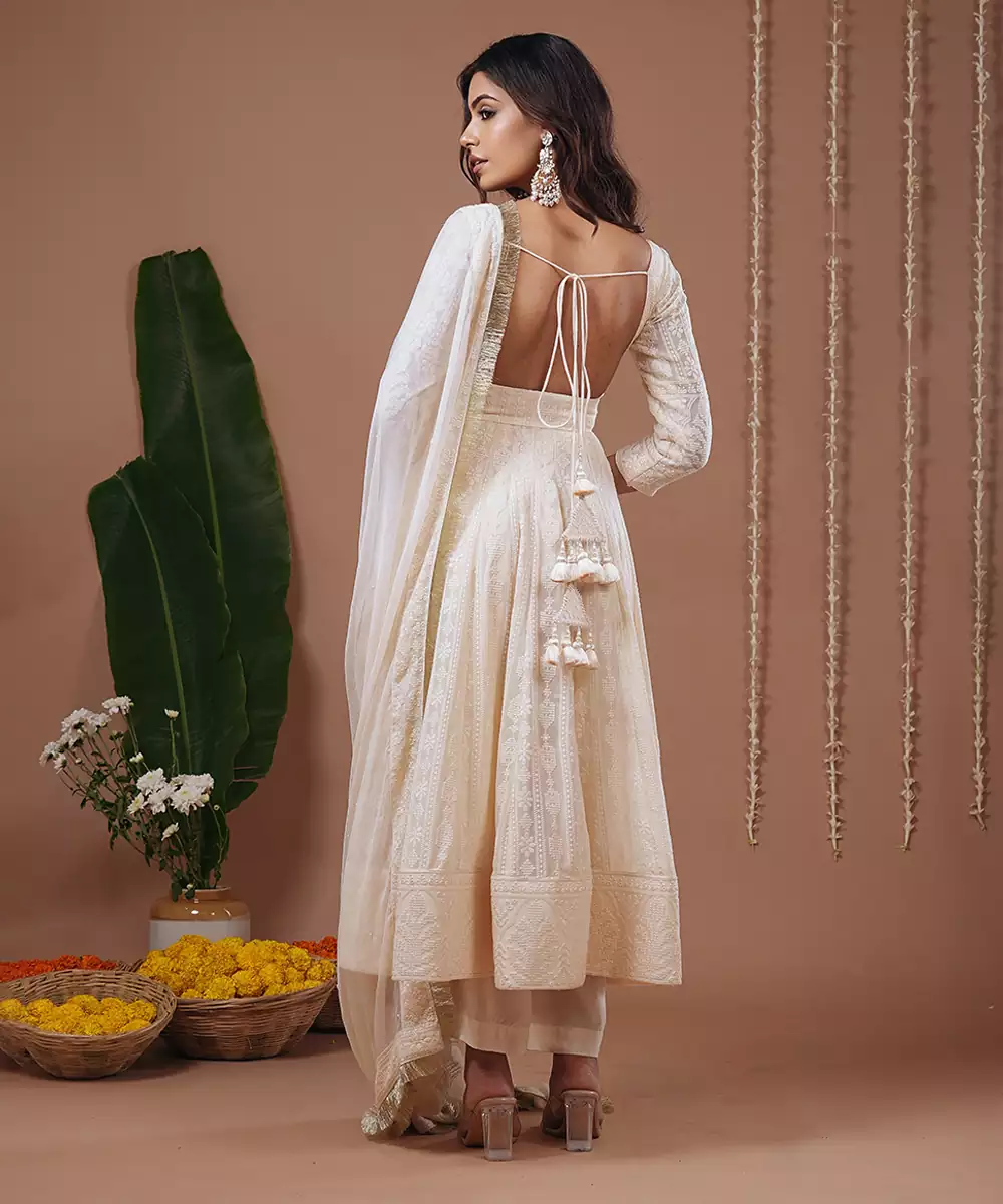 Classic Calf Length Anarkali With A Heavily Flared Ghera. Elegant Square Neckline – Modern And Flattering.Straight Cut Pants (Slightly Cropped Ankle Length).Dupatta Lightweight Chiffon In Ivory.Zari Border / Golden Tissue Piping Along The Edges.Small Tassel Trims On Dori For A Festive Touch.Side Zip Closure. In Anarkali Suitanarkali Length : 48 " , Palazzo Length: 36 " , Front Neck Depth: 9 " , Model Is Wearing Xxs Size , Model Height: 5’7”