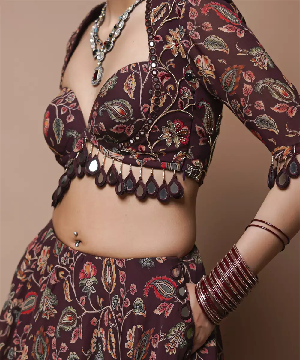 A Stylish Padded Blouse Which Blends Traditional Elegance With Contemporary Fashion, Making A Bold And Unique Statement And With Mirror Detailing All Through The Hem Of The Blouse And Sleeves.