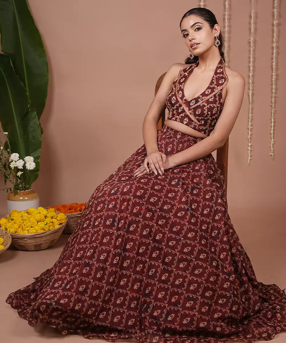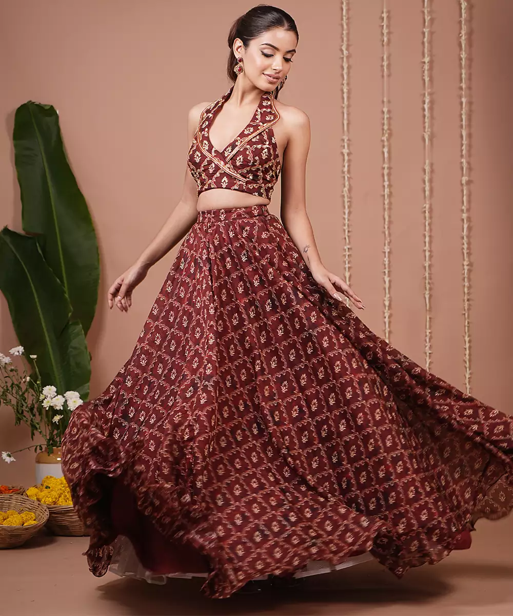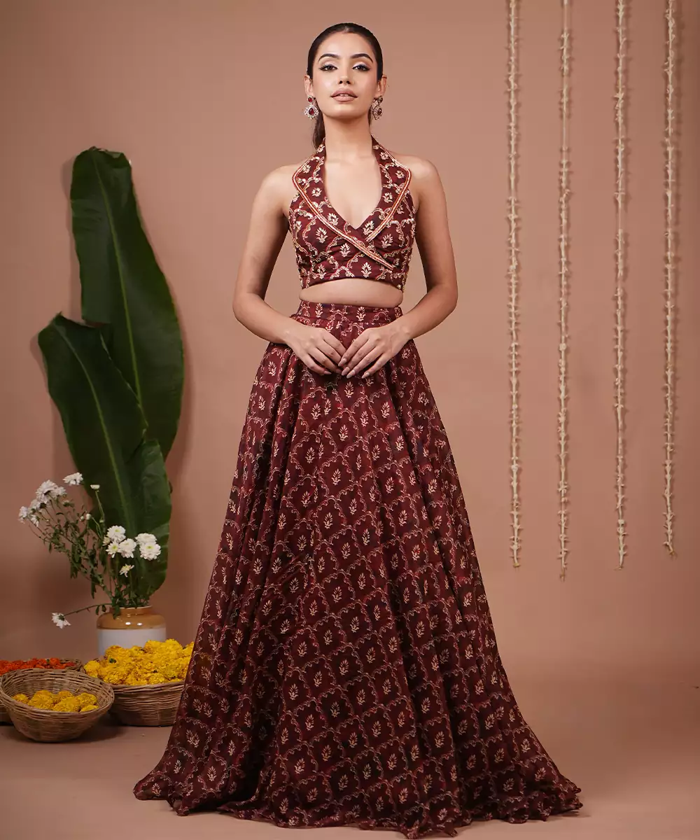 Halter Neck, Plunging Neckline With Structured Cups.Broad Collar Style Halter Strap Detail, Giving It A Chic, Modern Edge.Cropped Length, Accentuating The Waistline.High Waisted Full Length Lehenga Skirt.Soft Flare With Flowy Fall, Light & Easy To Carry.Same Print As Blouse, Creating A Coordinated Look. Side Pockets.Handwork With Zari,Moti, Cutdana .