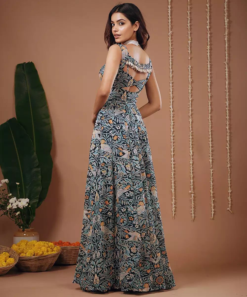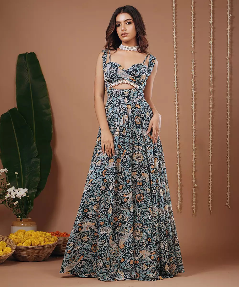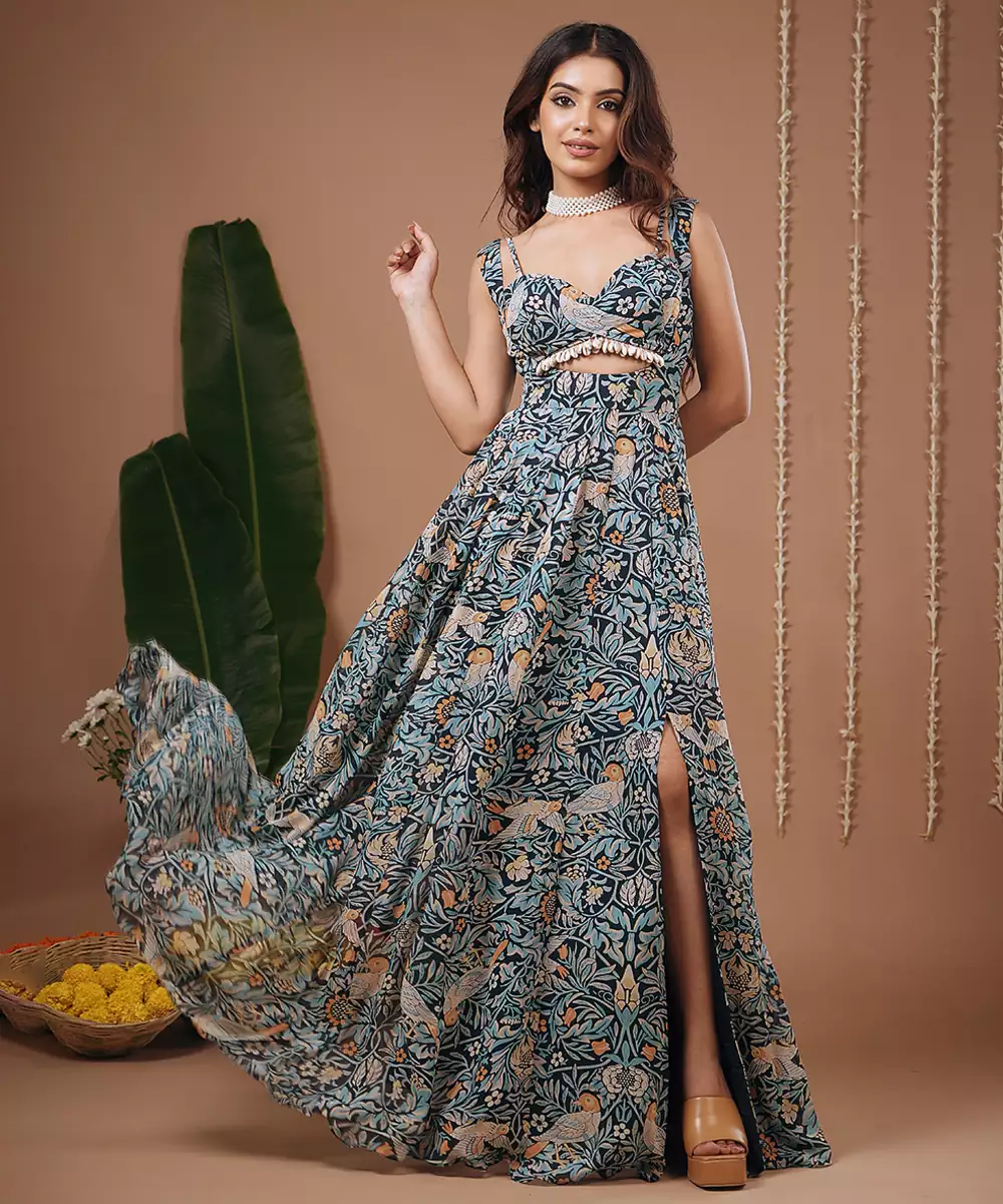 A Long Flowy Gown/ Maxi Dress With A Front Slit.Padded Bustier With Small Shell Attached All Over The Blouse And Back Strap.Neckline: Sweetheart Neckline. Deep Neckline With A Cut Out Detailing Below The Bust.Sleeveless With Thin Straps.Floral And Bird Inspired Print In Shades Of Teal,Ivory,Orange,Beige.Bustier Length: 13 " ,Dress Length : 60 " , Front Neck Depth: 9.5 " , Model Height: 5’7” , Heels : 4 " ,Model Is Wearing Xxs Size