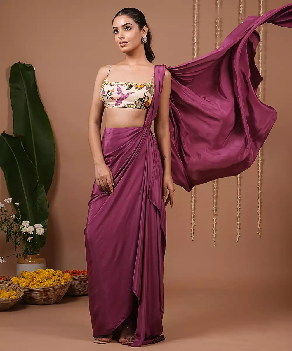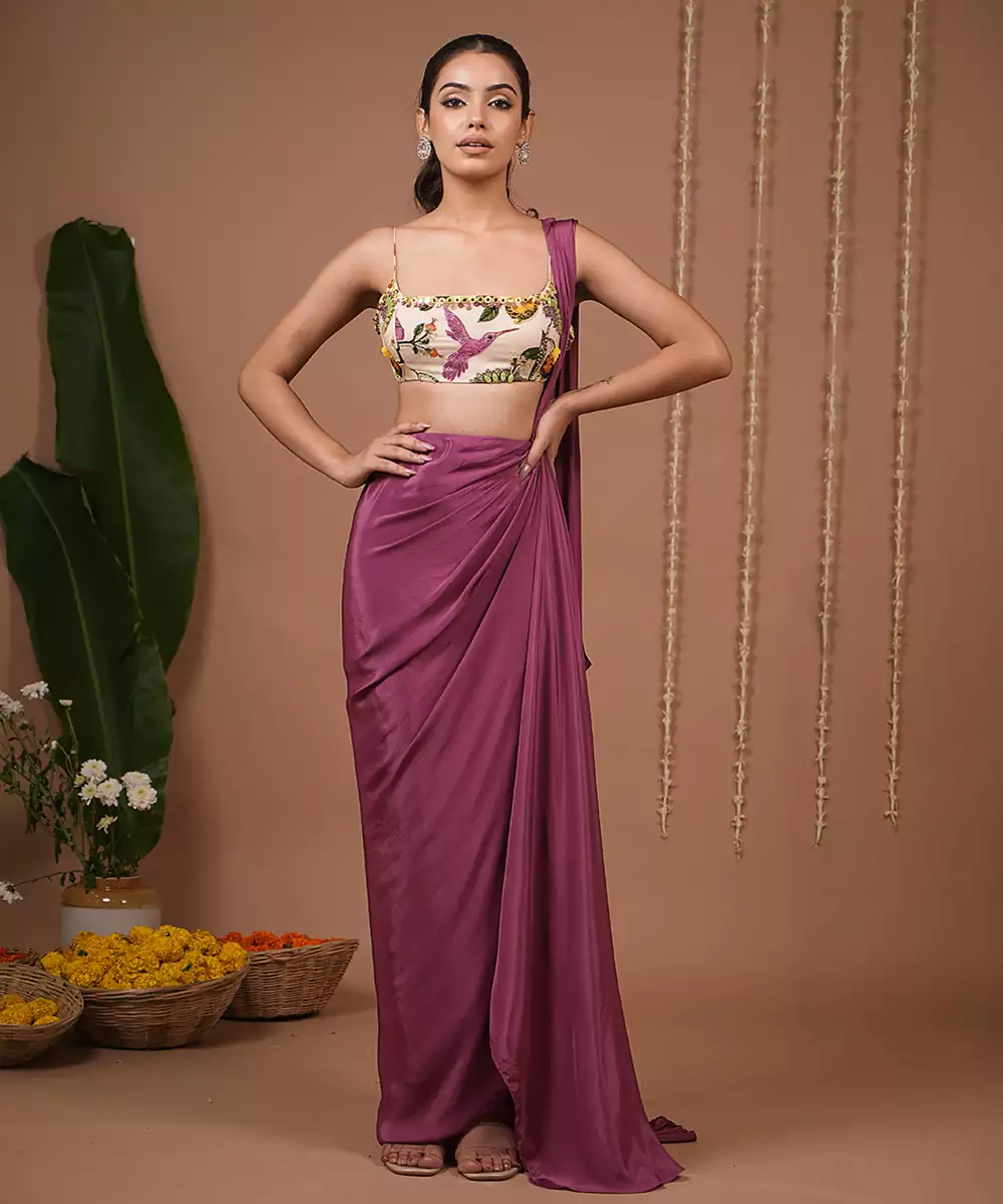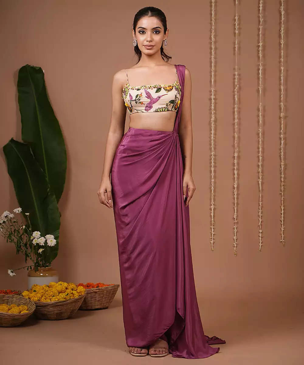 Straight Neckline With A Cropped, Structured Fitivory Base With Multicolor Hand Embroidery Featuring Florals And Birds (Butterfly & Hummingbird Motifs).Sleeveless For A Chic, Contemporary Look.Pre Draped Saree Style Skirt In Rich Plum.Effortless Fall With Pleated Drape Detailing Tucked At The Waist Fluid Movement For A Modern Twist On The Saree.Handwork Done On Both Front And Back And Is Finished With Back Hook. Skirt Length: 42 ,Model Size: Model Is Wearing Xxs Size , Model Height: 5’7”