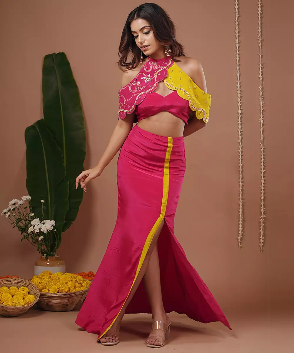 Cold Shoulder Bustier Top With An Asymmetrical Layered.The Cape Has Scalloped Edges And Is Embellished With Bead, Sequin,Moti,Resham.A High Waisted Straight Fit Long Skirt With A Front Thigh High Slit Lined With A Contrasting Yellow Border.Bold Hot Pink Base With Contrasting Yellow Cape Panel And Slit Lining.Bustier Length : 13 " , Skirt Length: 42 " , Front Neck Depth: 10 " , Model Height: 5’7” , Model Is Wearing Xxs Size
