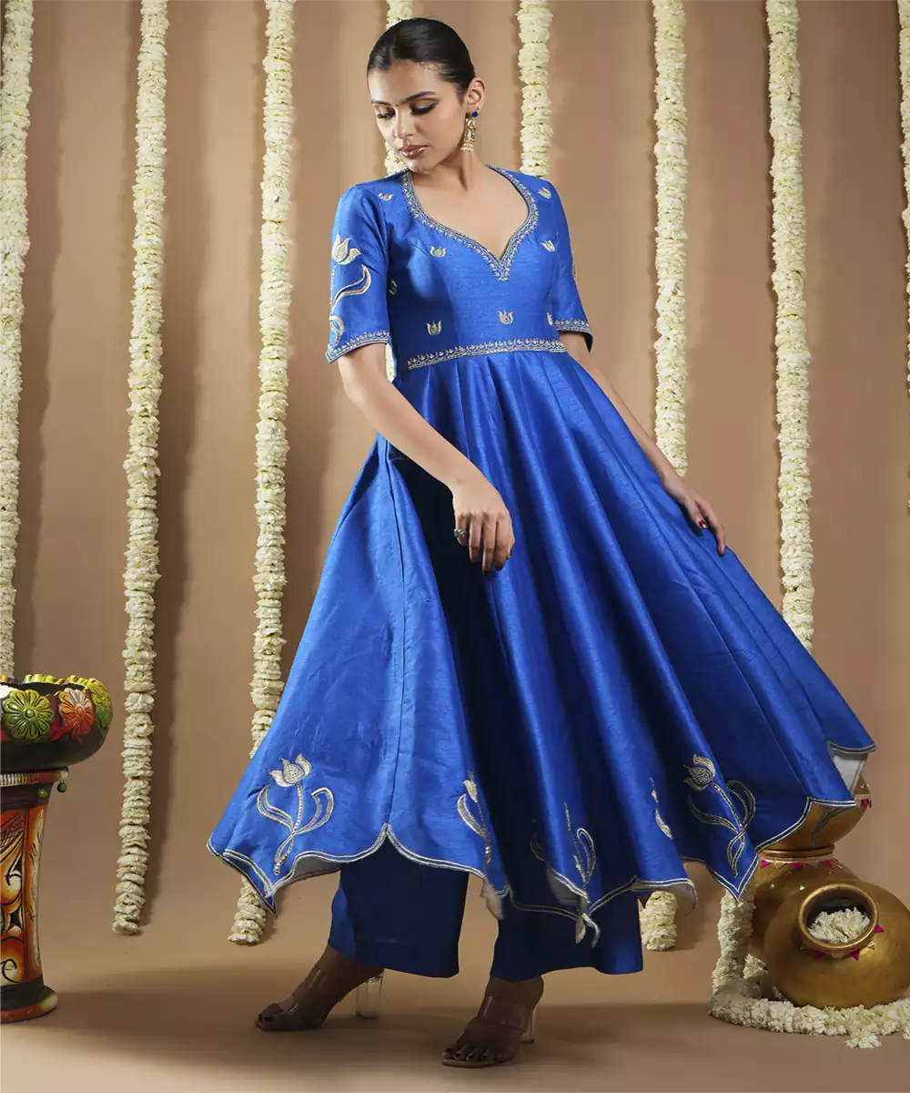 Royal Blue Silk Cutwork Anarkali Set With Handwork And Machine Embroidery On The Anarkali.