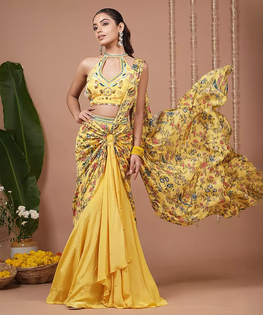 Sleeveless Halter Neck Blouse With Front Cut Out And Detailed Embroidery.Halter Neckline With Keyhole Cut Out In Front ,Multi Color Accents Give A Playful Festive Look.Pre Draped Skirt + Attached Pallu: Pre Stitched Draped Saree With Floral Printed Pallu.This Outfit Merges The Traditional Saree Silhouette With A Modern Pre Draped Format, Making It Youthful, Chic, And Easy To Wear.Back Zip Closure.Skirt Length: 44 ,Model Size: Model Is Wearing Xxs Size , Model Height: 5’7”