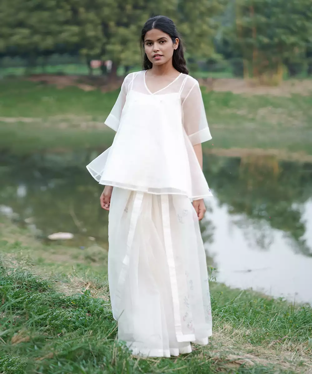 The Angrakha Top Is The Perfect Compliment To Any Bottom And Is Nothing Short Of Charming. Featuring Overlapping Panel, Half Sleevs And A Cotton Slip With Floral Hand Painting By Resist Batik, It Is A Comfy Carefree And Easy Wear That Speaks Of Mystical Days And Balmy Nights.