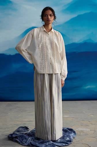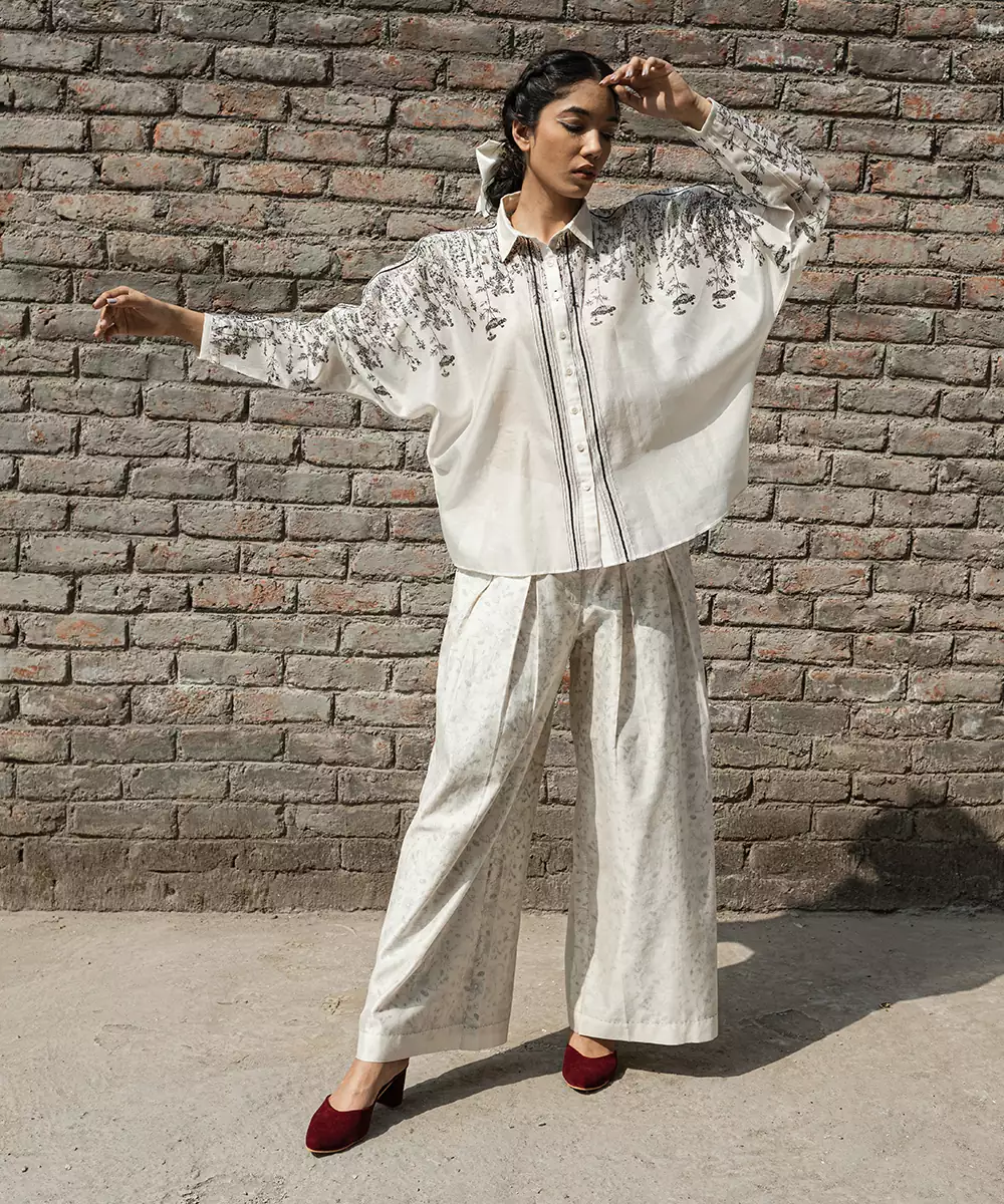 Featuring Printed Dolman Sleeves With High End Tailoring To Create A Shape That Whispers Simplicity. This Neat And Classic Shirt With A Sharp Edge Collar, A Front Placket With Pin Tucks And Tape Is Made For Women Who Appreciated Everyday Luxuries. Perfect For A Casual Office Day Or A Lively Office Setting With Its Slightly Oversized Silhouette.