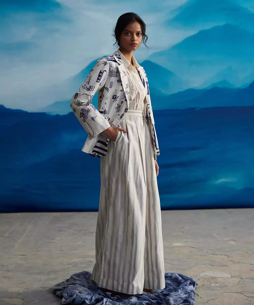 • Color: Ivory X000 B • Fabric: Chanderi X000 B • Lining: Cotton X000 B • Screen Printed By Hand X000 B • Pants With 4 Pleats In The Front
