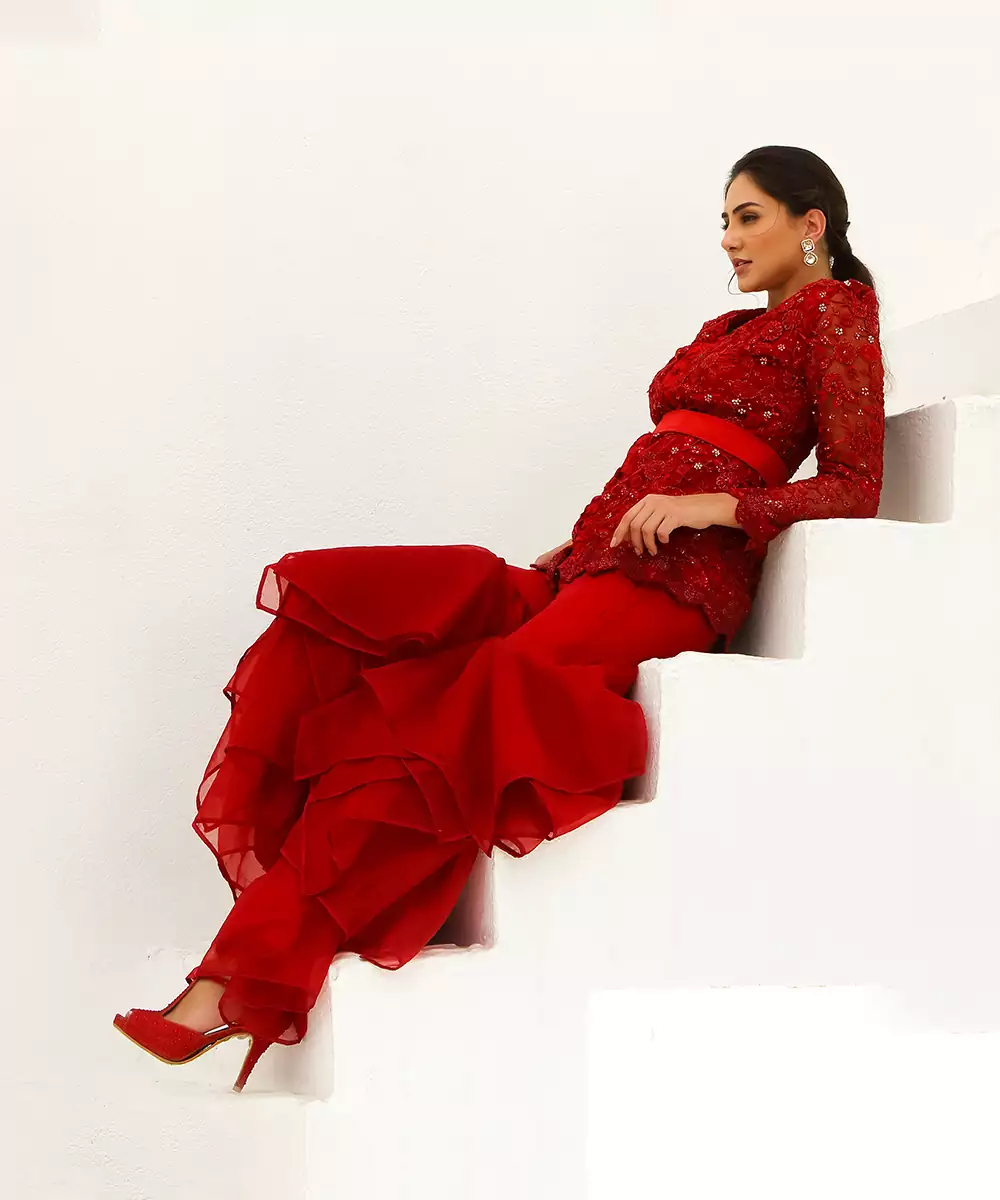 Featuring Carmine Scarlet Red Garara Set. Jacket With Fine Hand Embellished Work Is Paird With Our 3 Dimensional Heavy Garara.