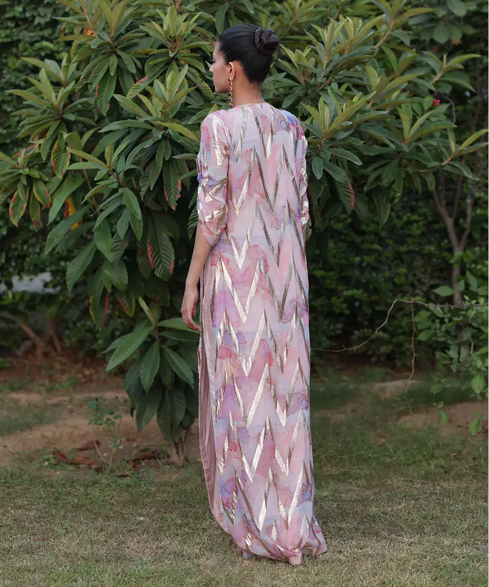 Featuring A Multicolour Abstract & Chevron Digital Printed Long Shirt Dress, Paired With Matching Pants. Color: Multicolour Fabric: Shirt Dress Georgette, Pant Cotton Silk Components: 2 (Dress, Pants) Work: Gold Foil Work