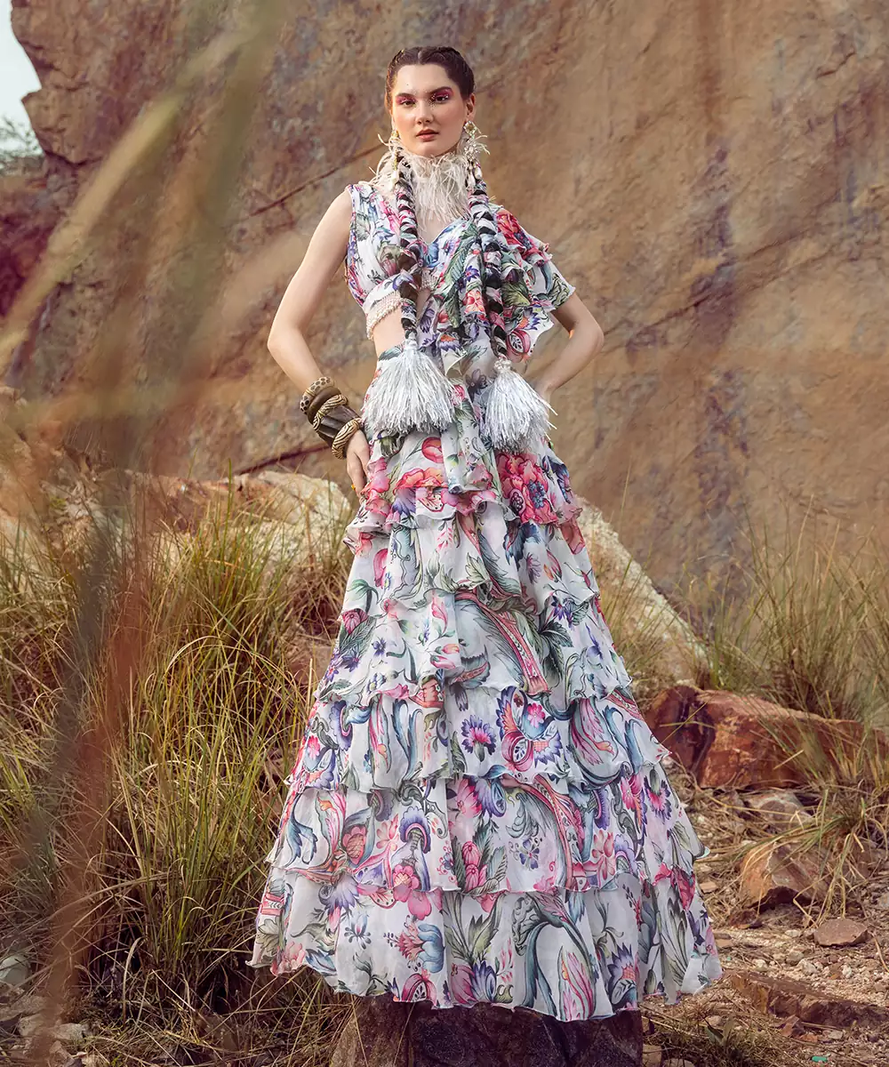 Layered Lehenga With Pleated Blouse With Pearl Detailing Drop Down. This Product Is Not Returnable.