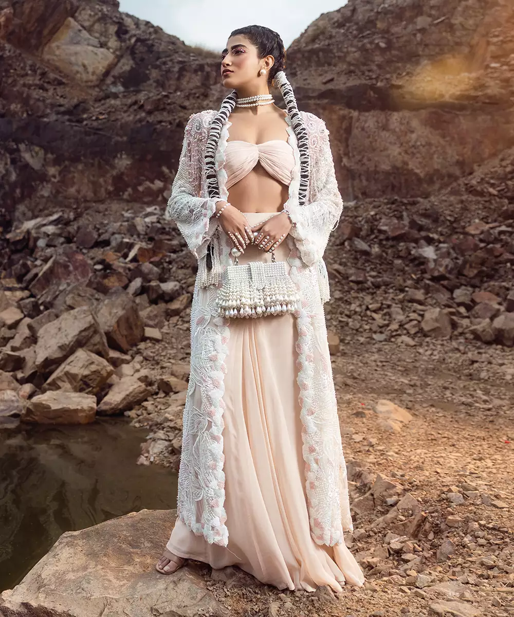 Nude Pink Pleated Skirt With Heavy Pearl Jacket And Pleated Buistier.