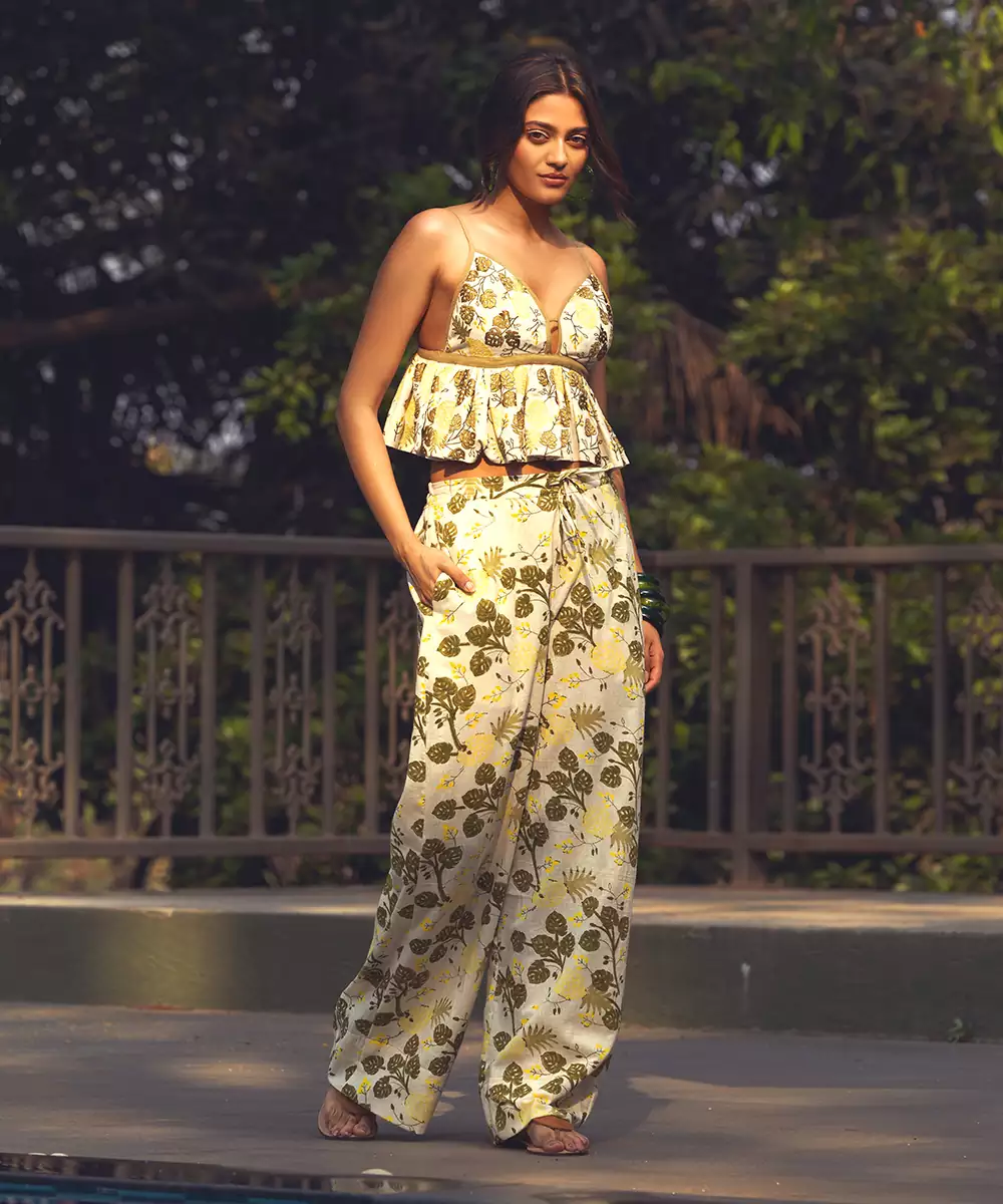 The Aloha Co Ordinated Set Features A Pineapple Leaf Print Peplum Crop Top With Elegant Embroidery And Adjustable Straps For A Comfortable Fit. The Top Includes A Side Opening For Added Visual Appeal. Paired With Extra Long Drawstring Pants Featuring Practical Side Pockets, This Ensemble Offers A Stylish And Contemporary Silhouette While Combining Chic Design With Functionality. A Versatile Addition To Any Wardrobe.