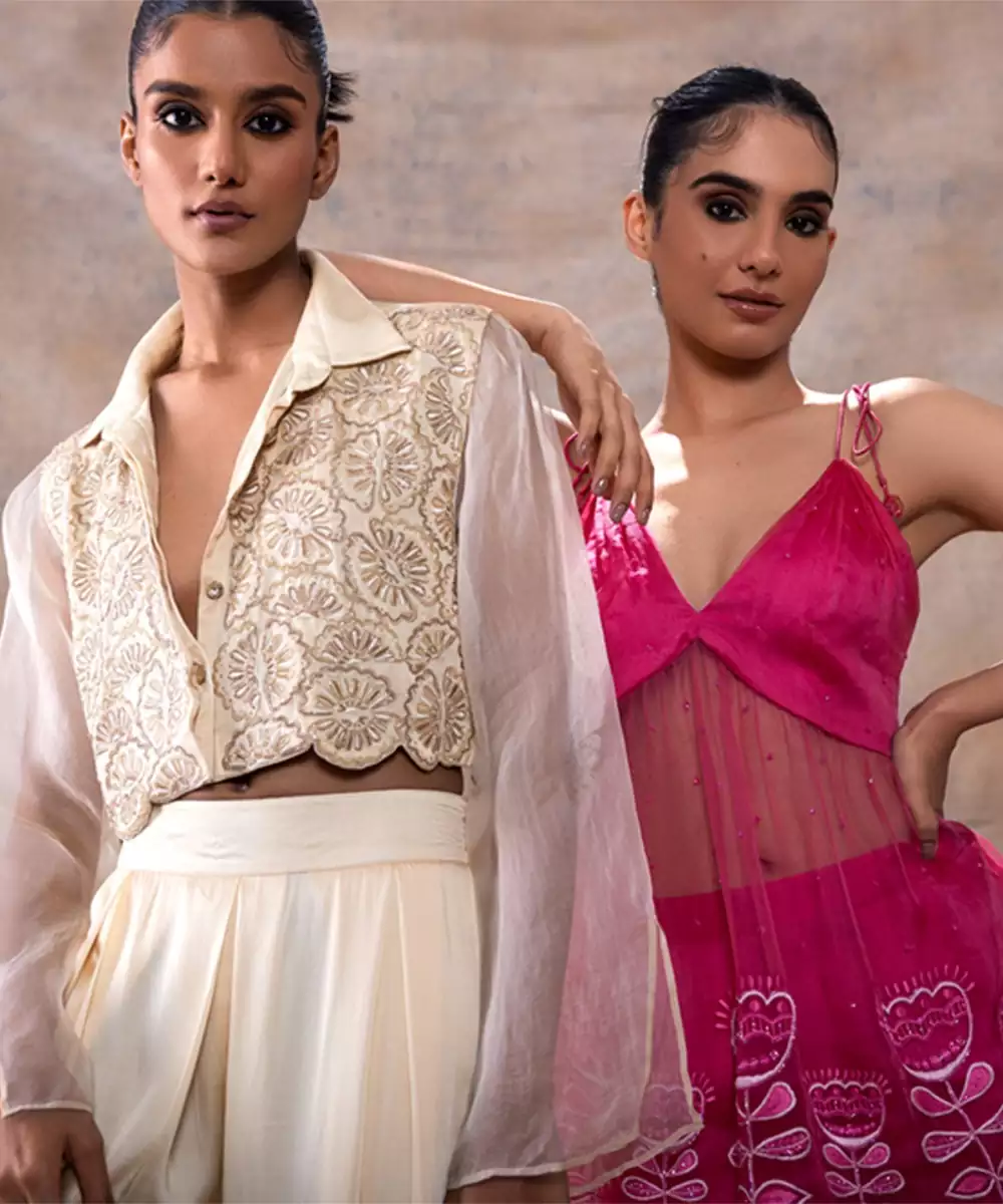 Elevate Your Style With This Stunning Crop Shirt And Pants Set, Perfect For Any Occasion. The Modal Silk Crop Shirt Is Adorned With Intricate Floral Hand Embroidery, Complemented By Flared Organza Sleeves That Add A Touch Of Elegance. Paired With Modal Silk, Box Pleated Flared Pants Featuring Side Pockets And A Side Zip Fastening, This Set Offers Both Comfort And Sophistication. The Versatile Design Allows You To Mix And Match For Various Looks, Making It A Must Have For Your Festive And Formal Wardrobe.