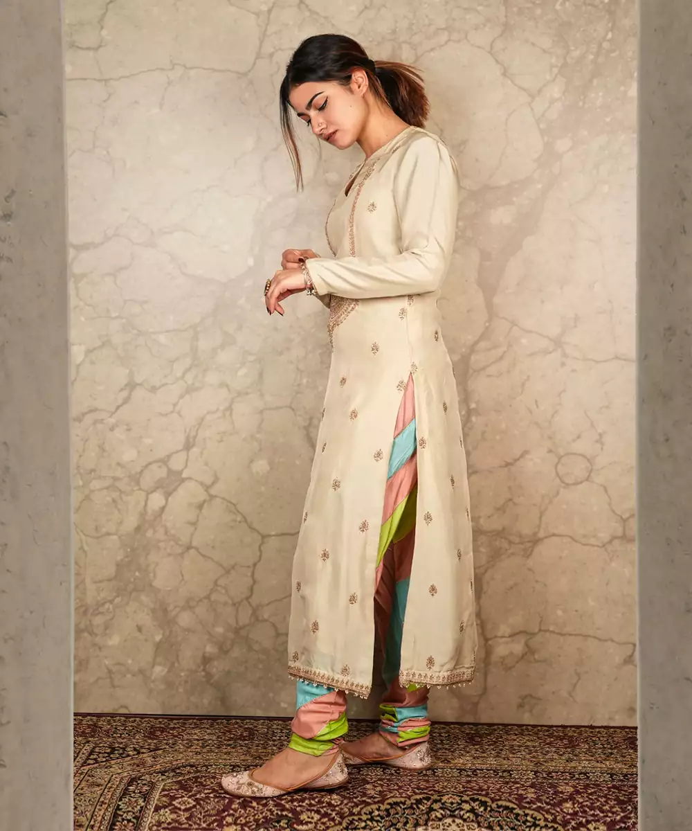 This Ivory Silk Suit Set Paired With Multicoloured Churidaar Is A Must Have In Your Ethnic Wear Collection.Classy And Fashionable This Beautiful Silk Suit Set Is Sure To Make Heads Turn.