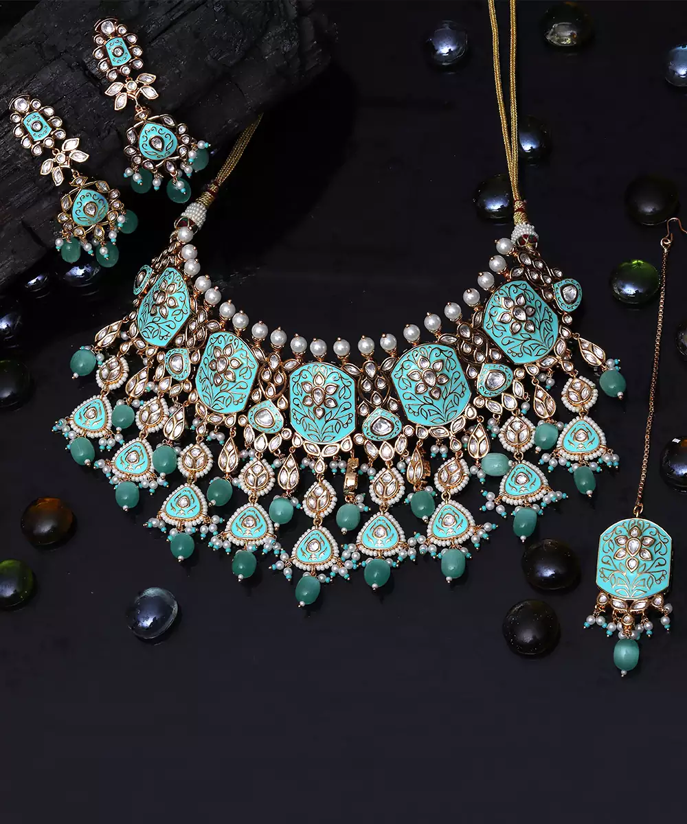 Adorn Yourself With The Exquisite Mint Meenakari Kundan Choker Set, Designed To Enhance Your Beauty On Your Special Occasion. The Choker Necklace Features Intricate Meenakari Work In A Refreshing Mint Color, Embellished With Sparkling Kundan Stones That Add A Touch Of Opulence. The Set Is Completed With Matching Danglers And A Maang Tikka, All Crafted With Attention To Detail To Create A Cohesive And Stunning Look. .