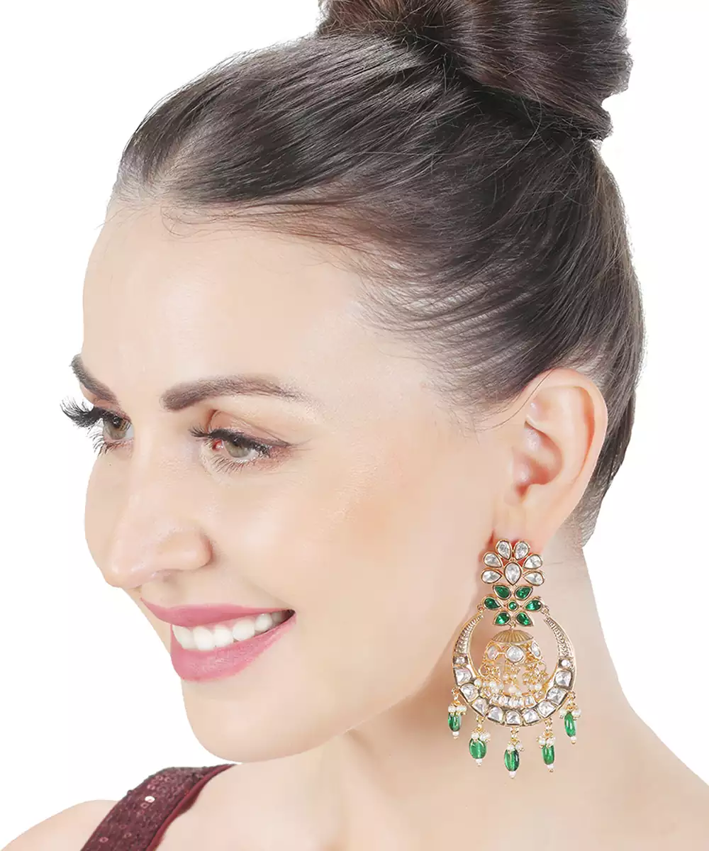 Elegant And Captivating, These Gold Finished Green Kundan Chand Balis Feature Intricate Craftsmanship. They Are Adorned With Delicate White And Green Beads, Adding A Touch Of Charm To Their Beauty. Perfect For Enhancing Any Festive Or Special Occasion Look. .