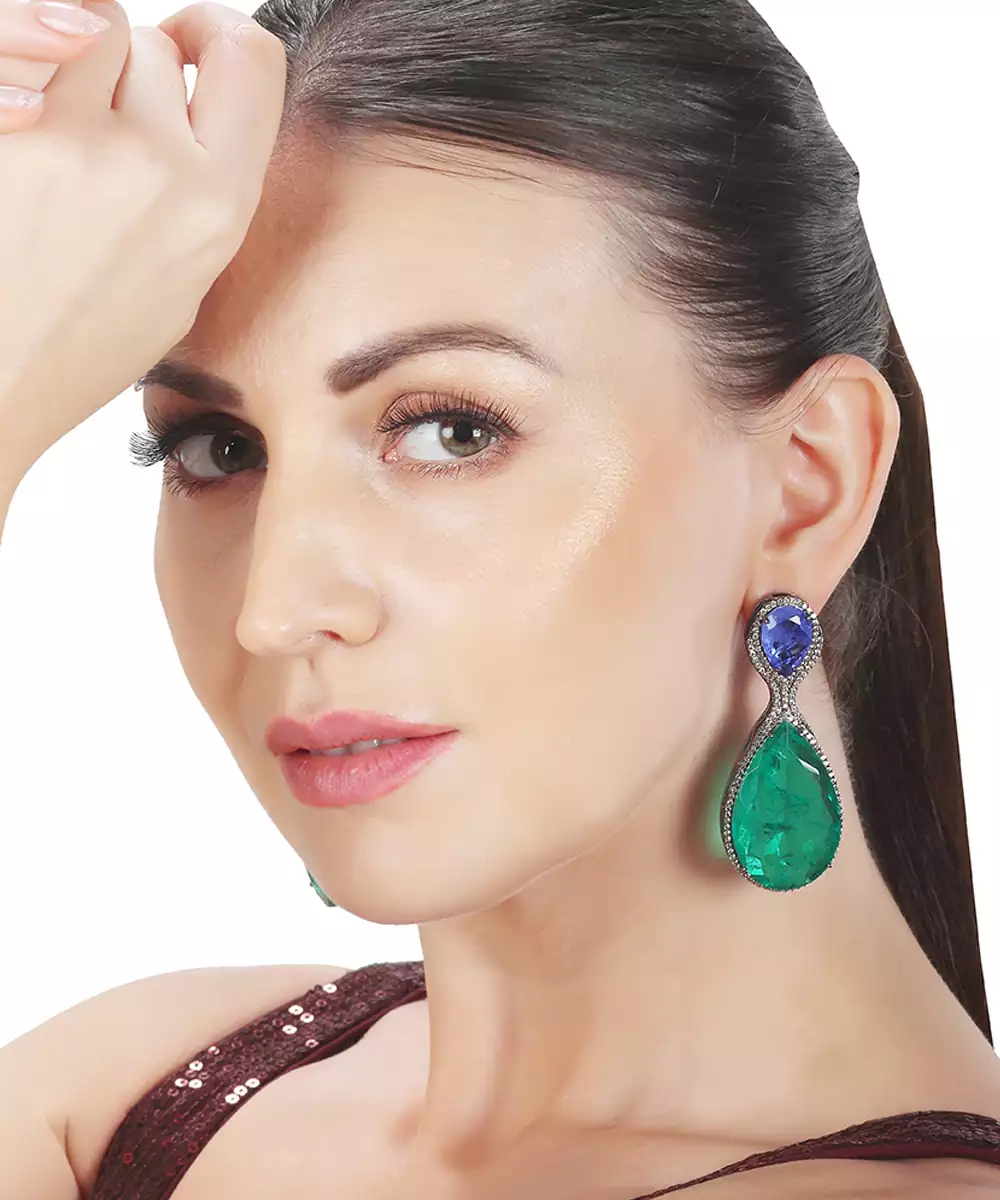 The Dew Drop Shaped Deep Emerald & Vibrant Sapphire Doublet Danglers Are Encircled By Sparkling Cubic Zirconia. The Deep Emerald And Vibrant Sapphire Doublets Create A Mesmerizing Contrast. These Danglers Exude Elegance And Allure, Making Them A Perfect Accessory For Adding A Pop Of Color And Sophistication To Any Ensemble. .