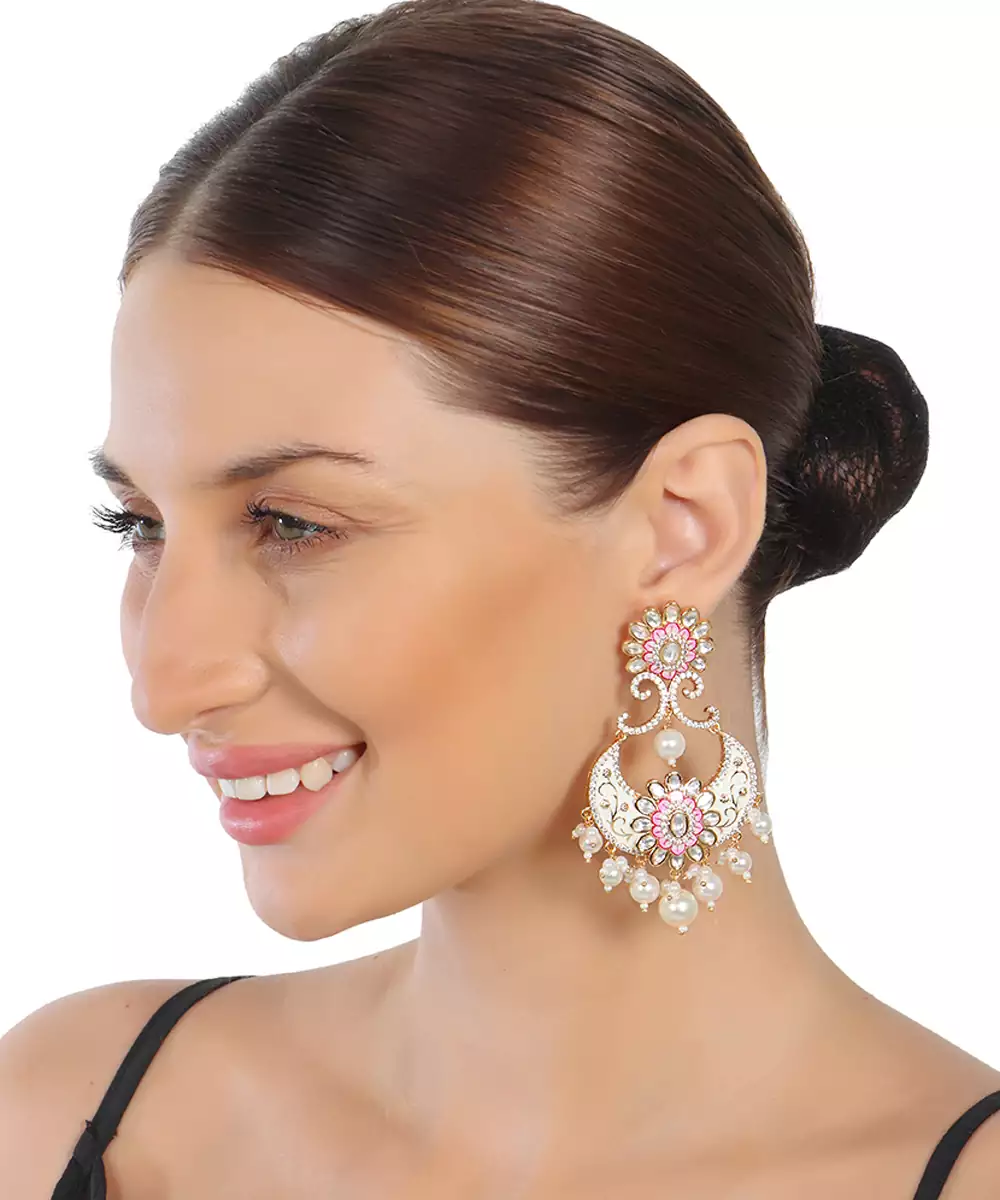 Exquisite Pink And White Kundan Meenakari Danglers Adorned With Faux Diamonds And Pearls. These Earrings Radiate Elegance And Beauty, Making Them A Perfect Accessory For Special Occasions And Celebrations. .