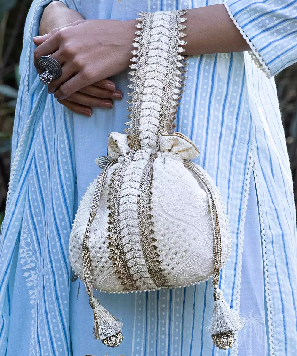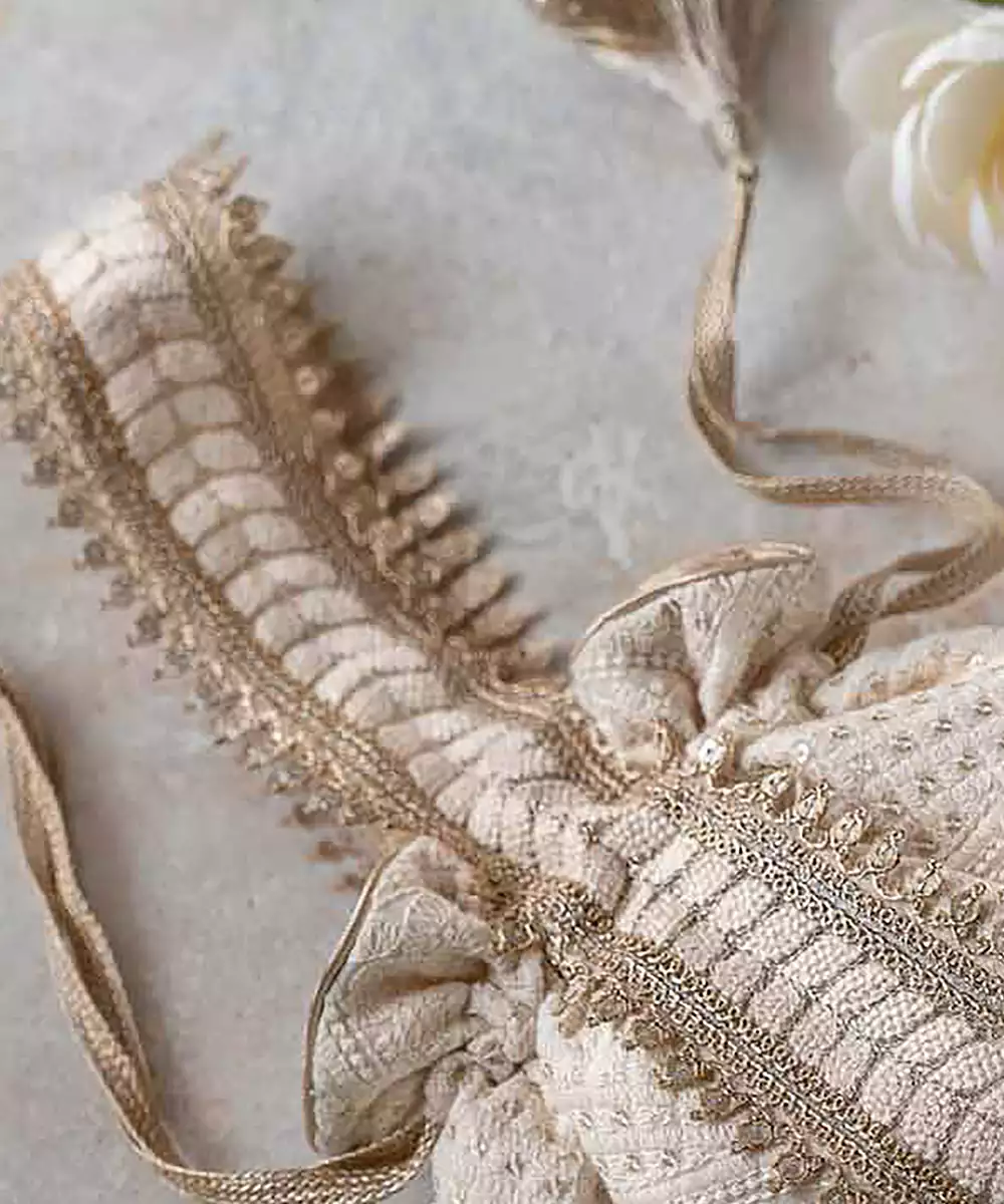 Khazana From The Imperials Our Lustrous Off White Mughal Potlis Which Are Meticulously Handcrafted And Embellished With Gold Lace Handles And Zari Silk Tassels. Be Ready For All The Jodha Akbar Vibes When You Style Them On Yourself!