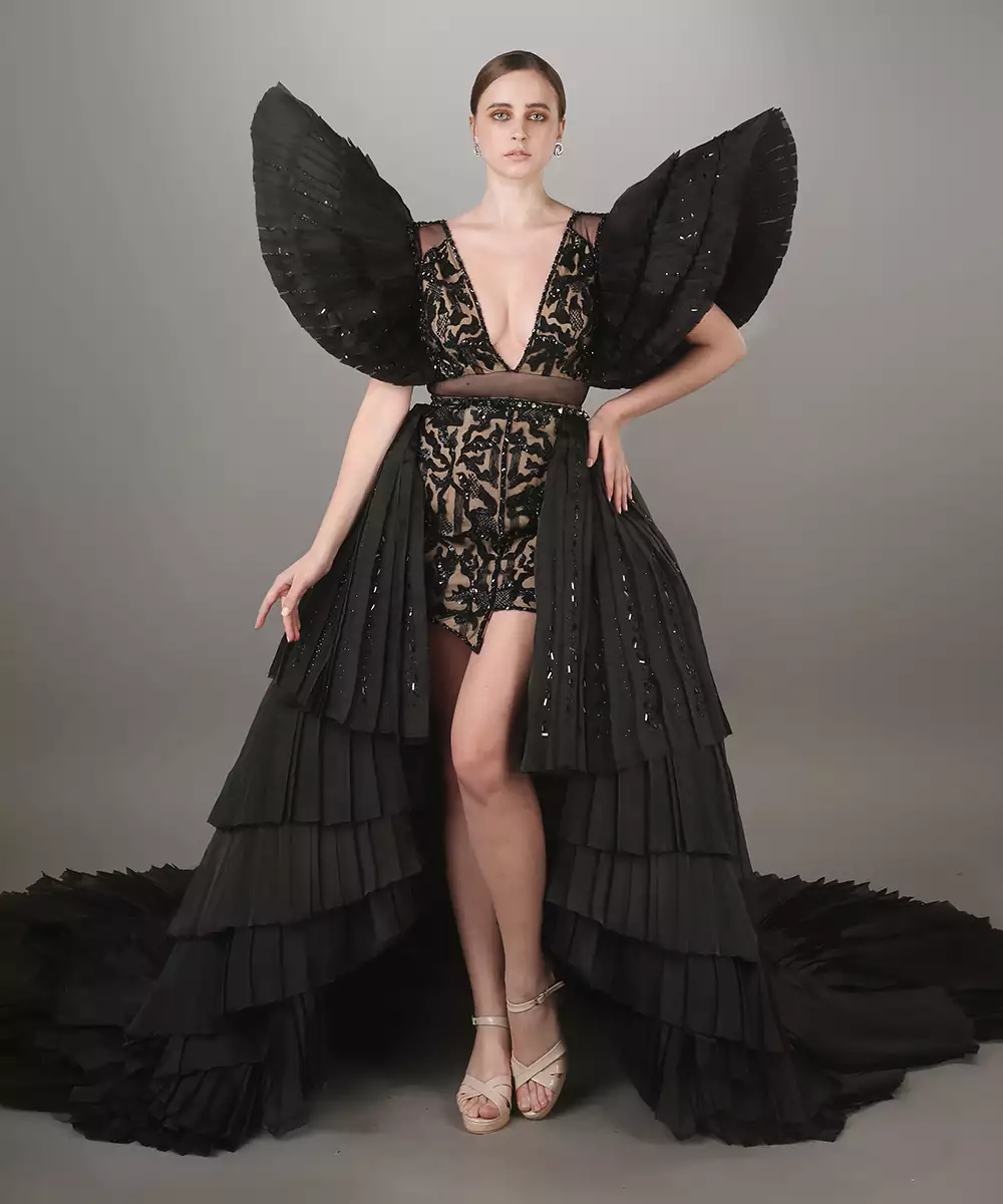 Black Embroidered Mini Dress With Pleated Power Shoulder And A Detachable Layered Pleated Trail.