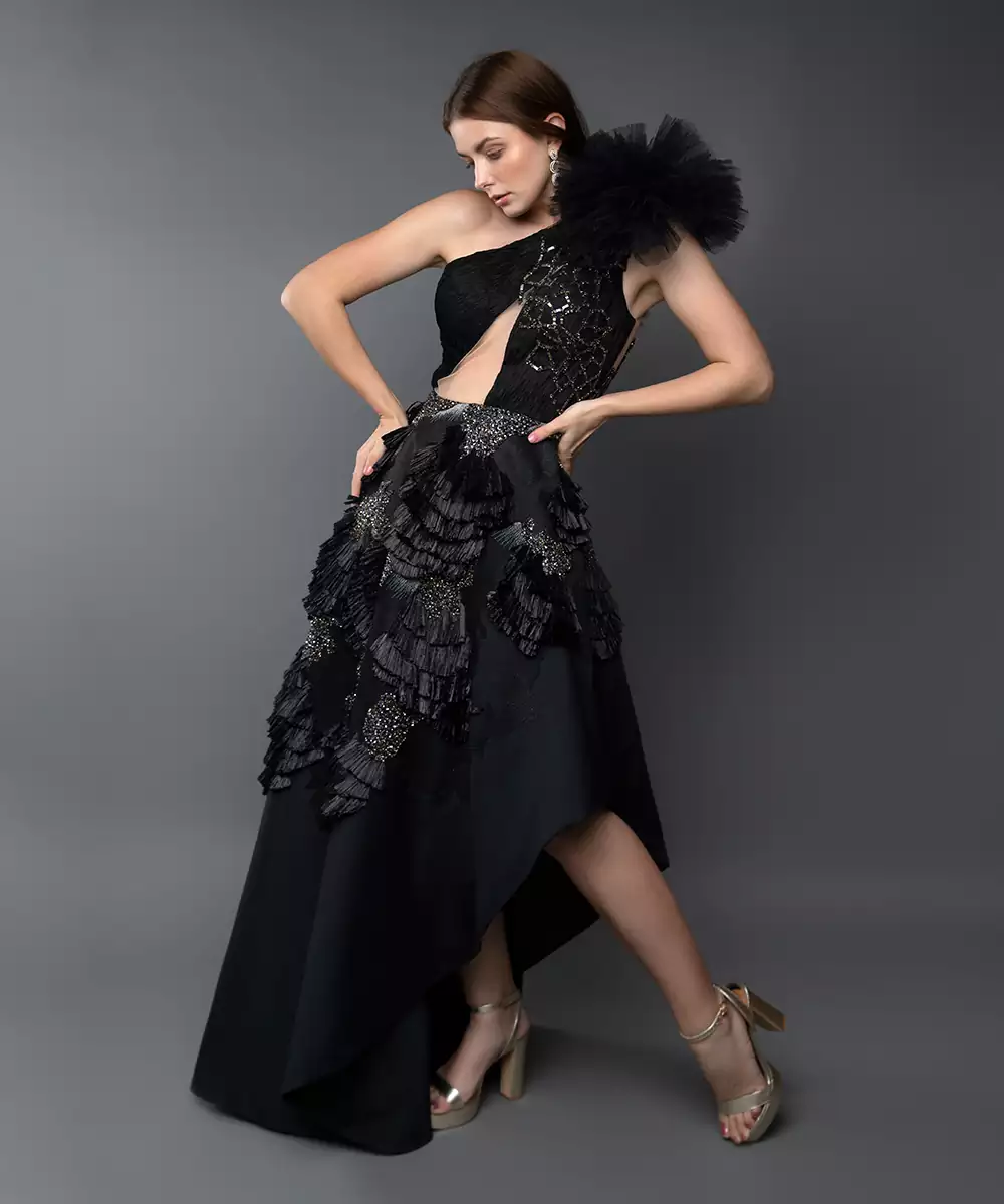 Black One Shoulder Ruched Asymmetrical Power Shoulder Gown.
