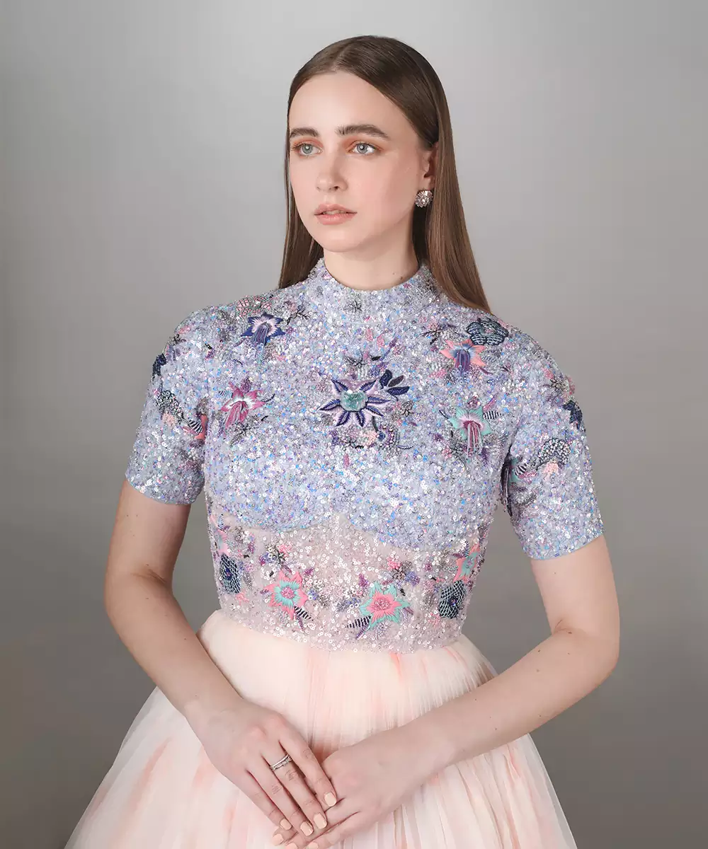 Blue And Pink Shaded Ball Gown With Heavily Embroidered Bodice.