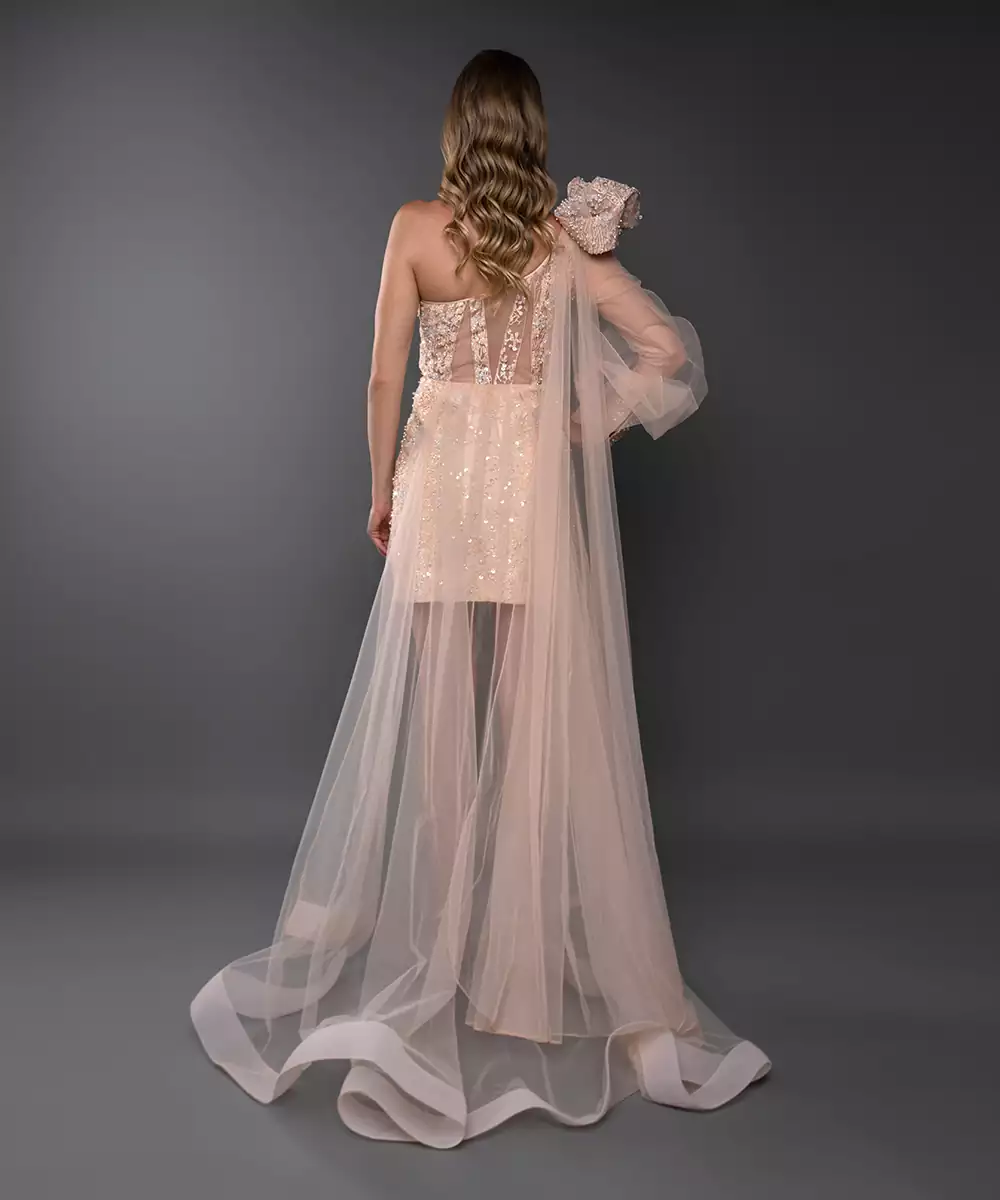 Peach One Sleeve Power Shoulder Embroidered Trail Dress.