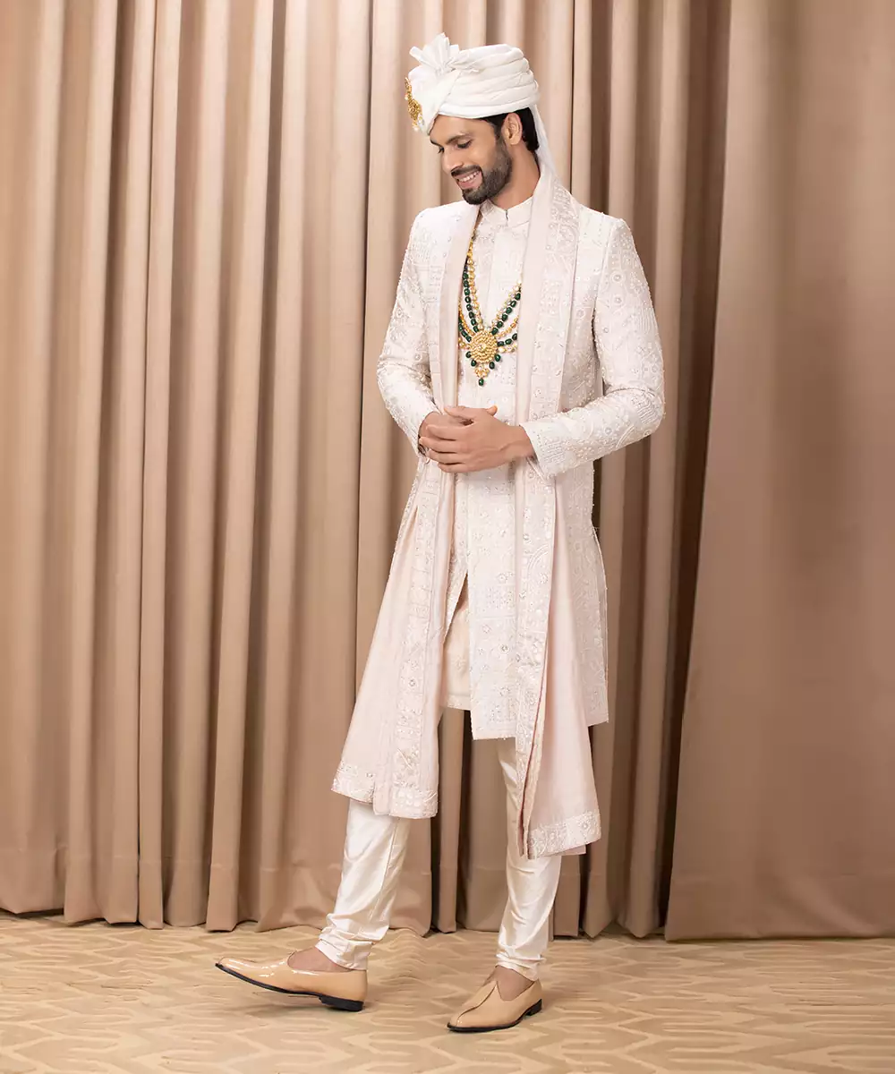 Featuring A Traditional Hand Embroidered Powder Pink Sherwani With Intricate Detailings. Perfect For A Classy Wedding. This Comes With A Powder Pink Cotton Silk Kurta, Powder Pink Embroidered Stole And Churidaar.
