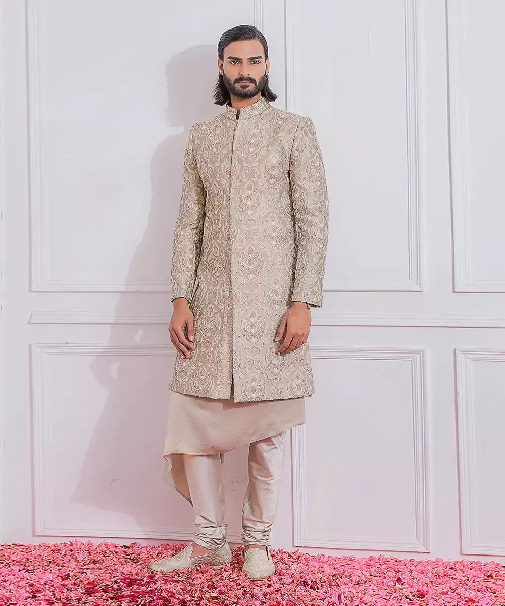 Featuring A Traditional Yet Contemporary Grey Sherwani In Jaquard Fabric With Delicate Hand Embroidery. Perfect For The Modern Day Groom. Includes: Only Sherwani.