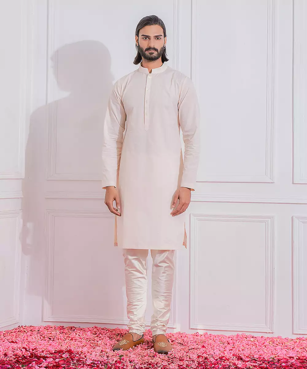 Featuring A Traditional Yet Contemporary Dusty Pink Sherwani With Delicate Machine Embroidery And Intricate Details. Perfect For The Modern Day Groom. Includes : Kurta, Churidaar, Stole And Safa Fabric.