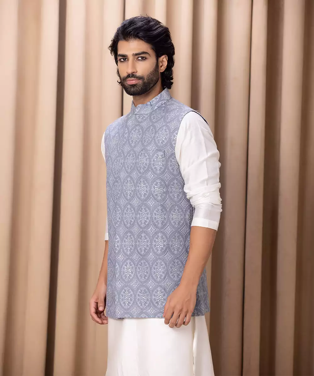 Featuring A Traditional Lucknowi Ash Grey Nehru Jacket With Delicate Thread And Sequence Embroidery. Perfect For Any Indoor Or Outdoor Occasion. Pair It Up With Ankit V Kapoor's Ivory Kurta Set.
