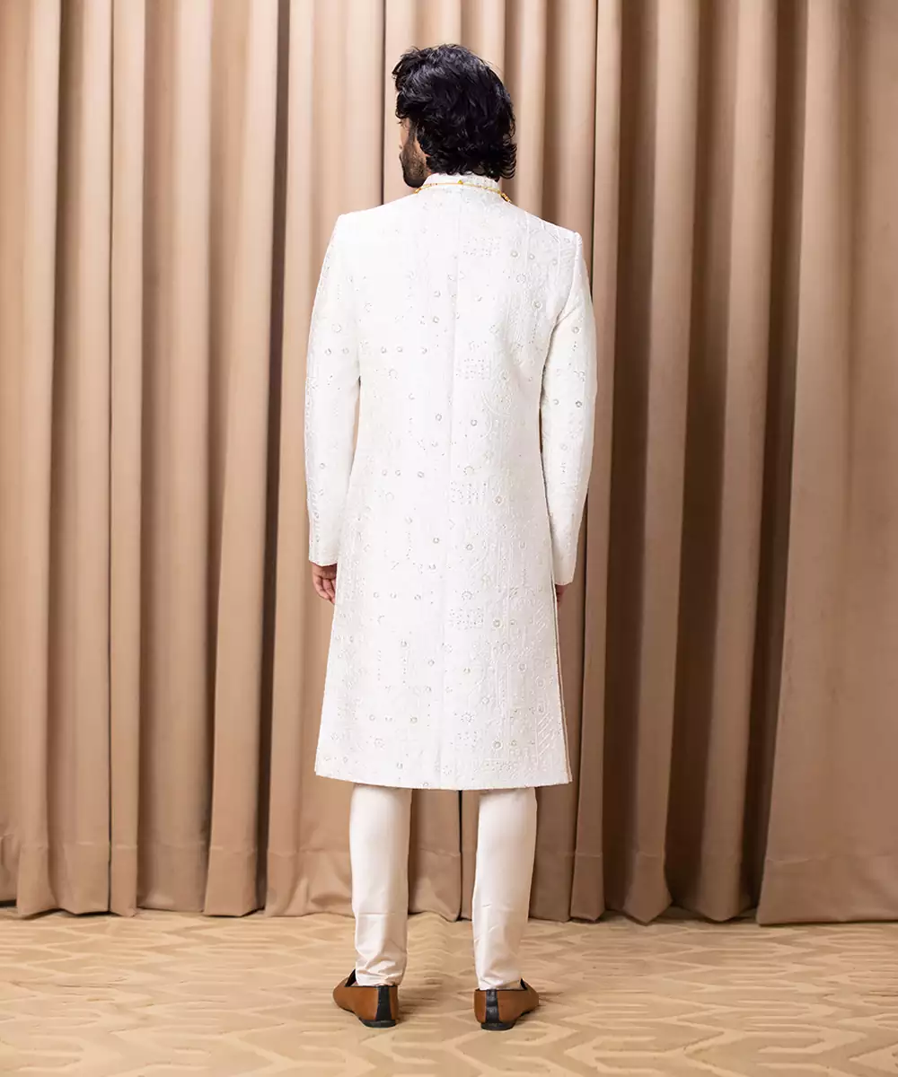 Featuring A Traditional Machine Embroidered Ivory Sherwani With Intricate Detailings. Perfect For A Classy Wedding. This Comes With An Ivory Cotton Silk Kurta, Ivory Embroidered Stole And Ivory Churidaar.