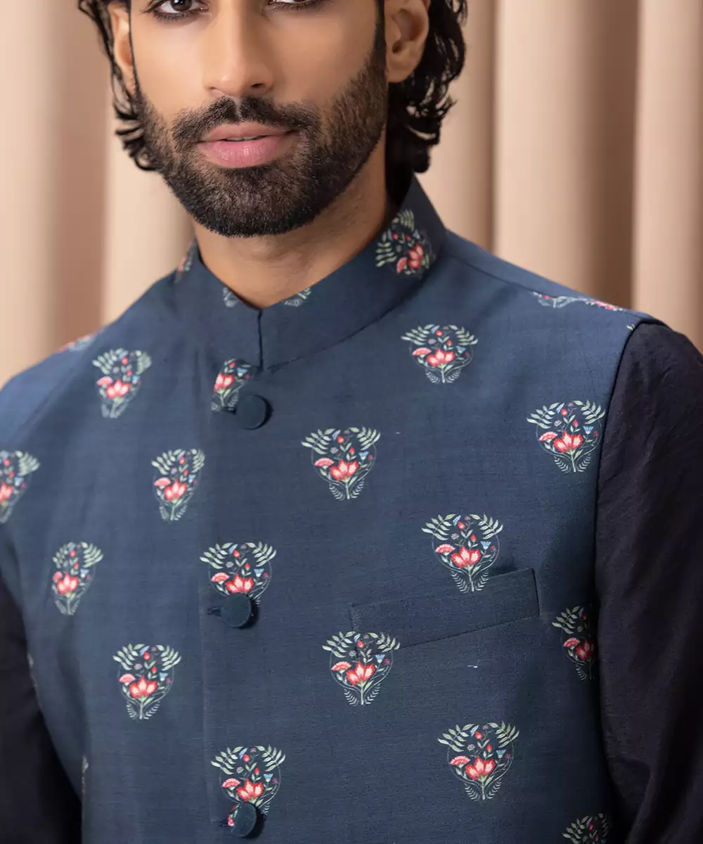 Featuring A Contemporary Printed Blue Nehru Jacket With Delicate Hand Painted Designed Motifs. Perfect For Any Indoor Or Outdoor Occasion. Comes With Ankit V Kapoor's Blue Kurta Set.