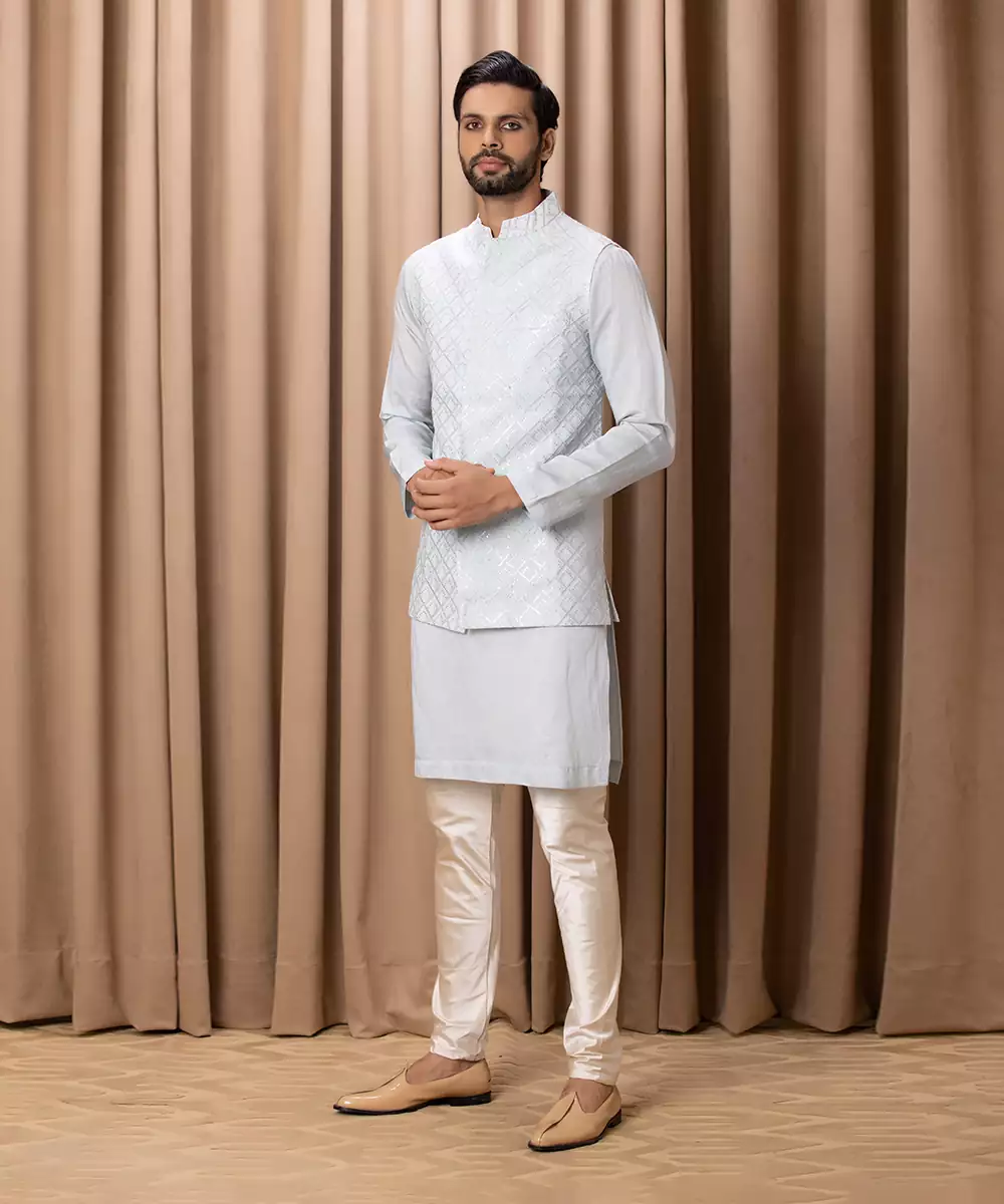 Featuring A Traditional Thread Work Powder Blue Nehru Jacket With Delicate Thread And Sequence Embroidery And Minimal Details. Perfect For An Outdoor Occcasion. Pair This With A Tonal Plain Powder Blue Cotton Silk Kurta And Ivory Churidaar.