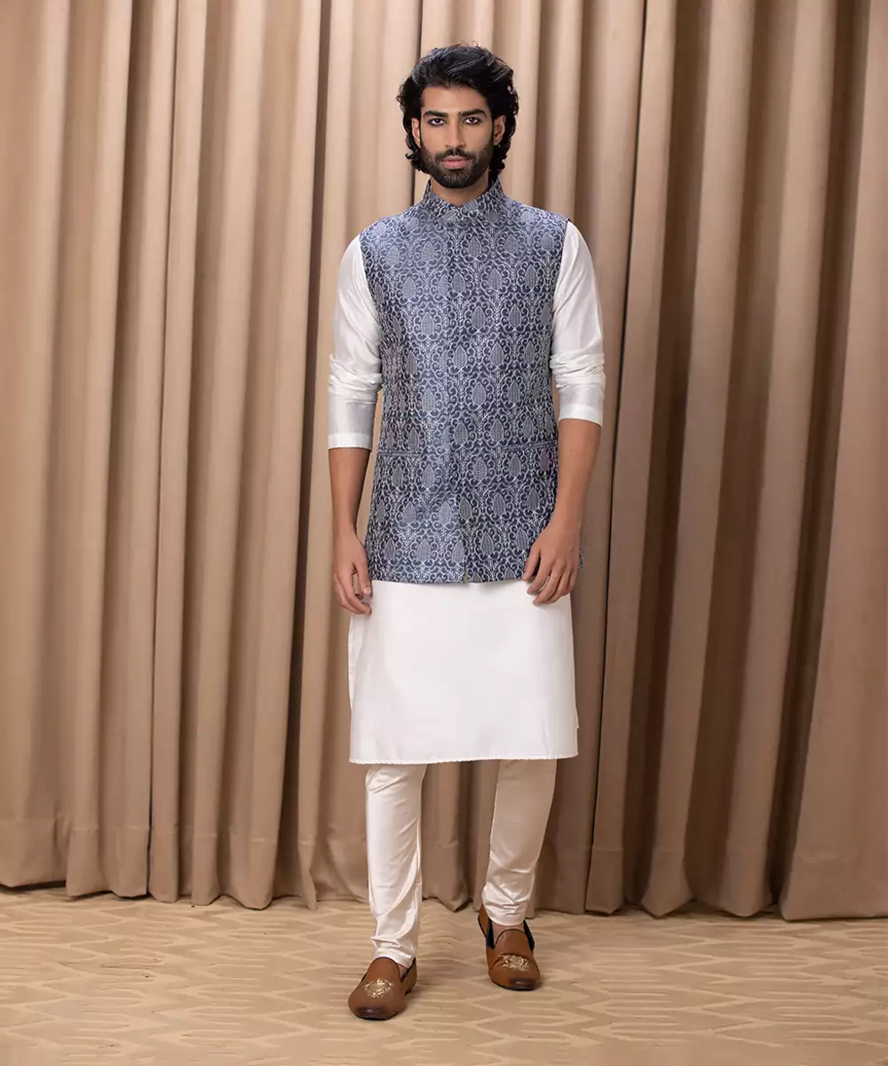 Featuring A Traditional Cerulean Blue Nehru Jacket With Delicate Machine Embroidery And Minimal Details. Perfect For Any Indoor Or Outdoor Occasion. Comes With Ankit V Kapoor's Ivory Kurta Set.