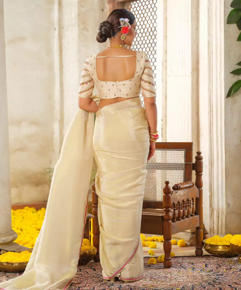 Radiate Timeless Elegance In This Ivory Embroidered Tissue Silk Saree. Crafted From Premium Tissue Silk, It Features A Sophisticated Metallic Sheen And A Delicate, Airy Drape. Detailed With Intricate Tonal Embroidery And Shimmering Accents, This Saree Is The Perfect Blend Of Traditional Craftsmanship And Modern Luxury For Any High Glam Occasion.