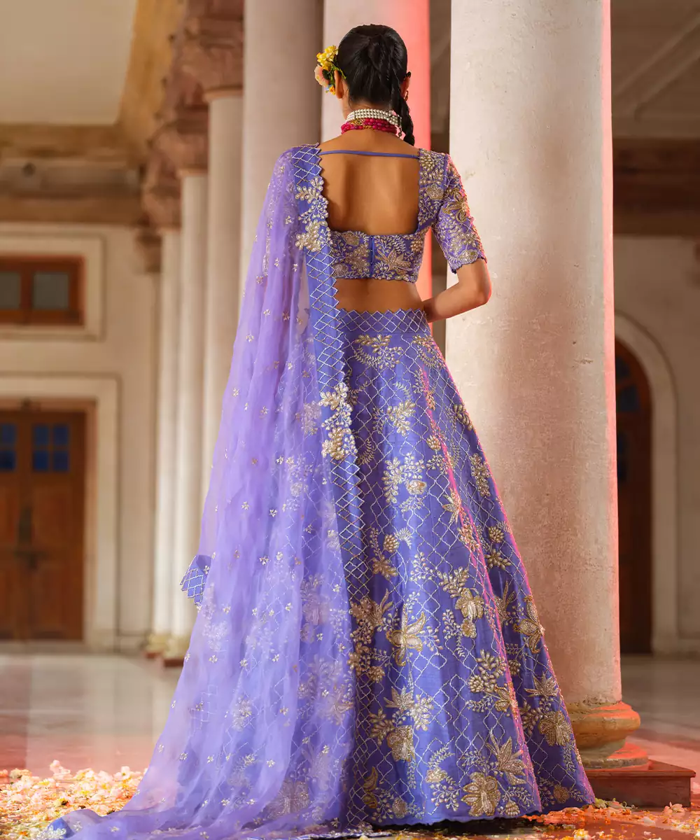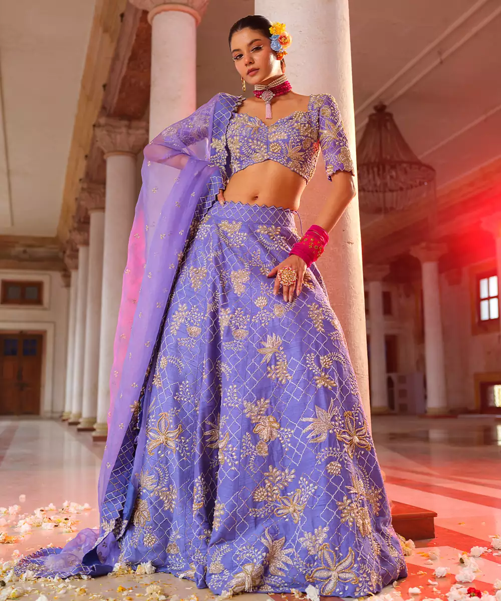 A Graceful Lavender Silk Lehenga Set Highlighted With Delicate Embroidery For A Soft Yet Luxurious Appeal. The Smooth Silk Fabric Flows Beautifully, While Intricate Detailing Adds Festive Elegance. Paired With A Coordinated Blouse And Dupatta, This Ensemble Is Ideal For Weddings, Receptions, And Stylish Festive Celebrations.