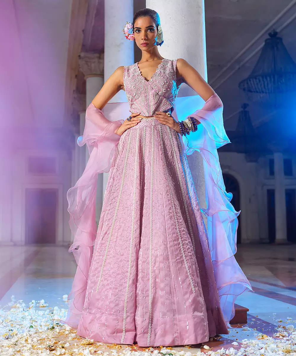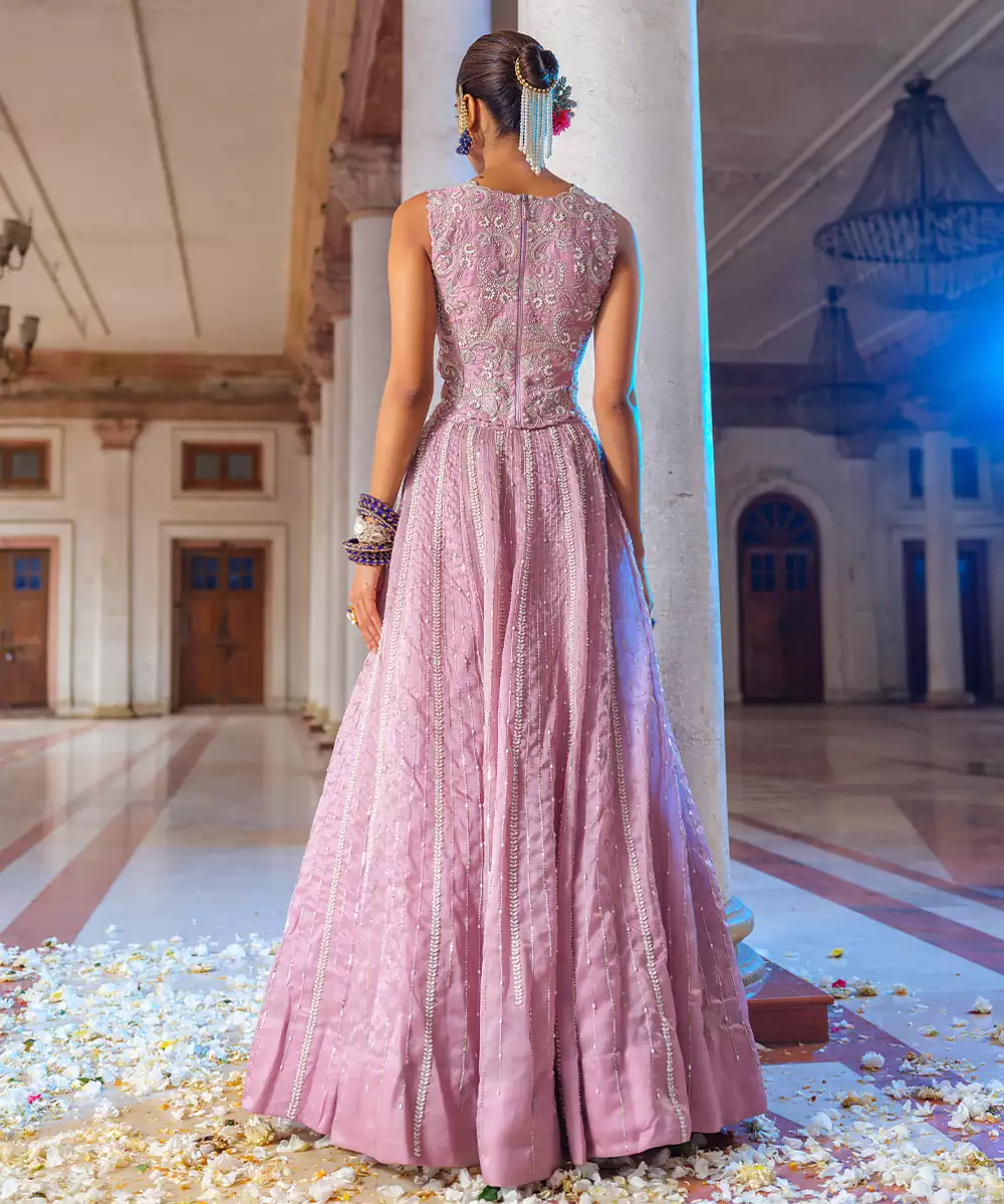 A Dreamy Mauve Organza Lehenga Set Embellished With Intricate Embroidery, Offering A Light And Ethereal Look. The Sheer Organza Fabric Creates A Graceful Silhouette, While Detailed Motifs Add Refined Charm. Paired With A Matching Blouse And Dupatta, It Is Perfect For Weddings, Receptions, And Elegant Festive Occasions.