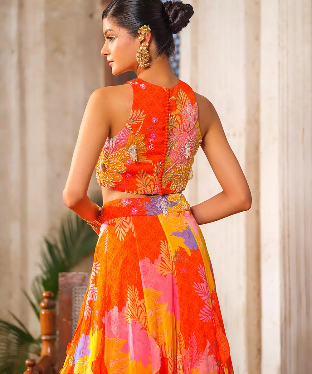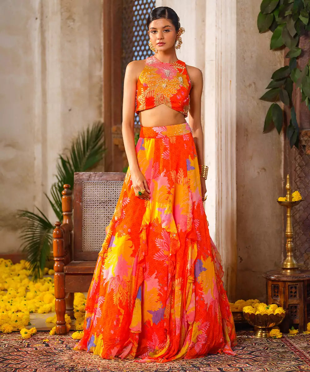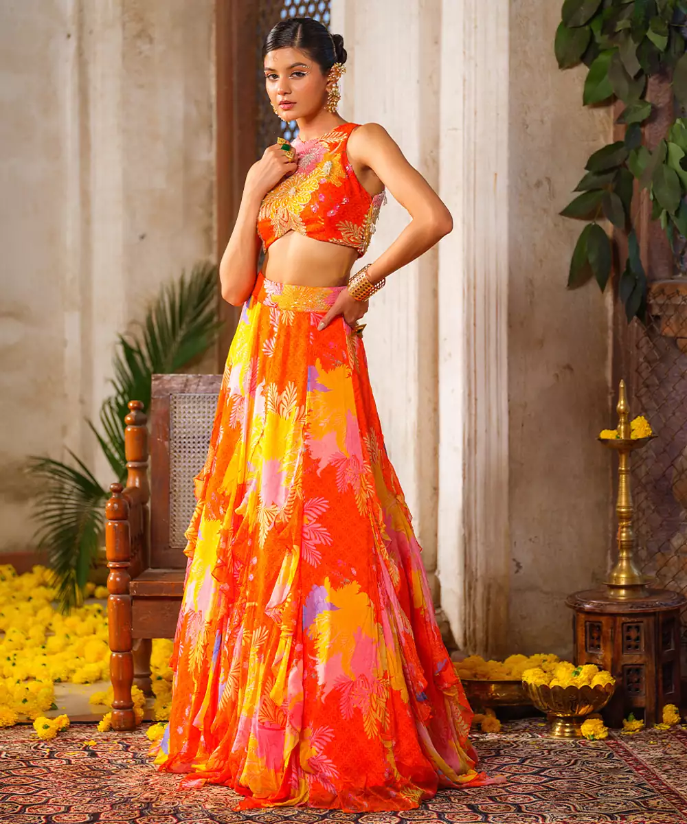 A Vibrant Multicolor Printed Chiffon Lehenga Paired With A Matching Blouse, Perfect For A Light And Breezy Festive Look. The Flowy Chiffon Fabric Ensures Graceful Movement, While Colorful Prints Add Playful Charm. Ideal For Daytime Functions, Parties, And Cheerful Celebrations With Effortless Elegance.