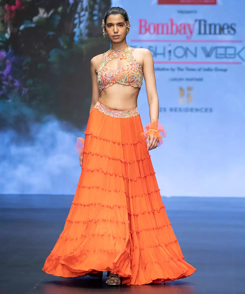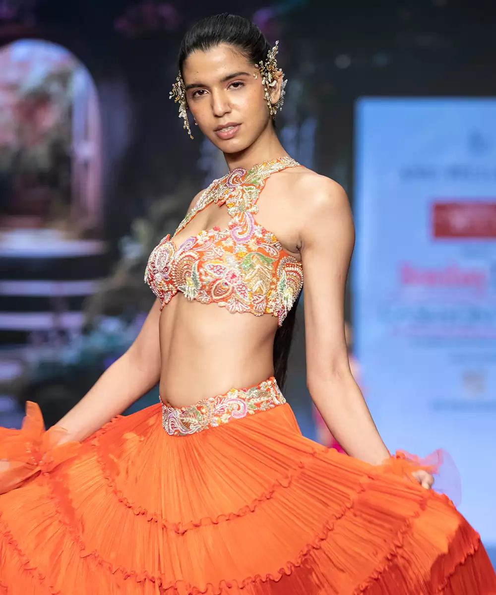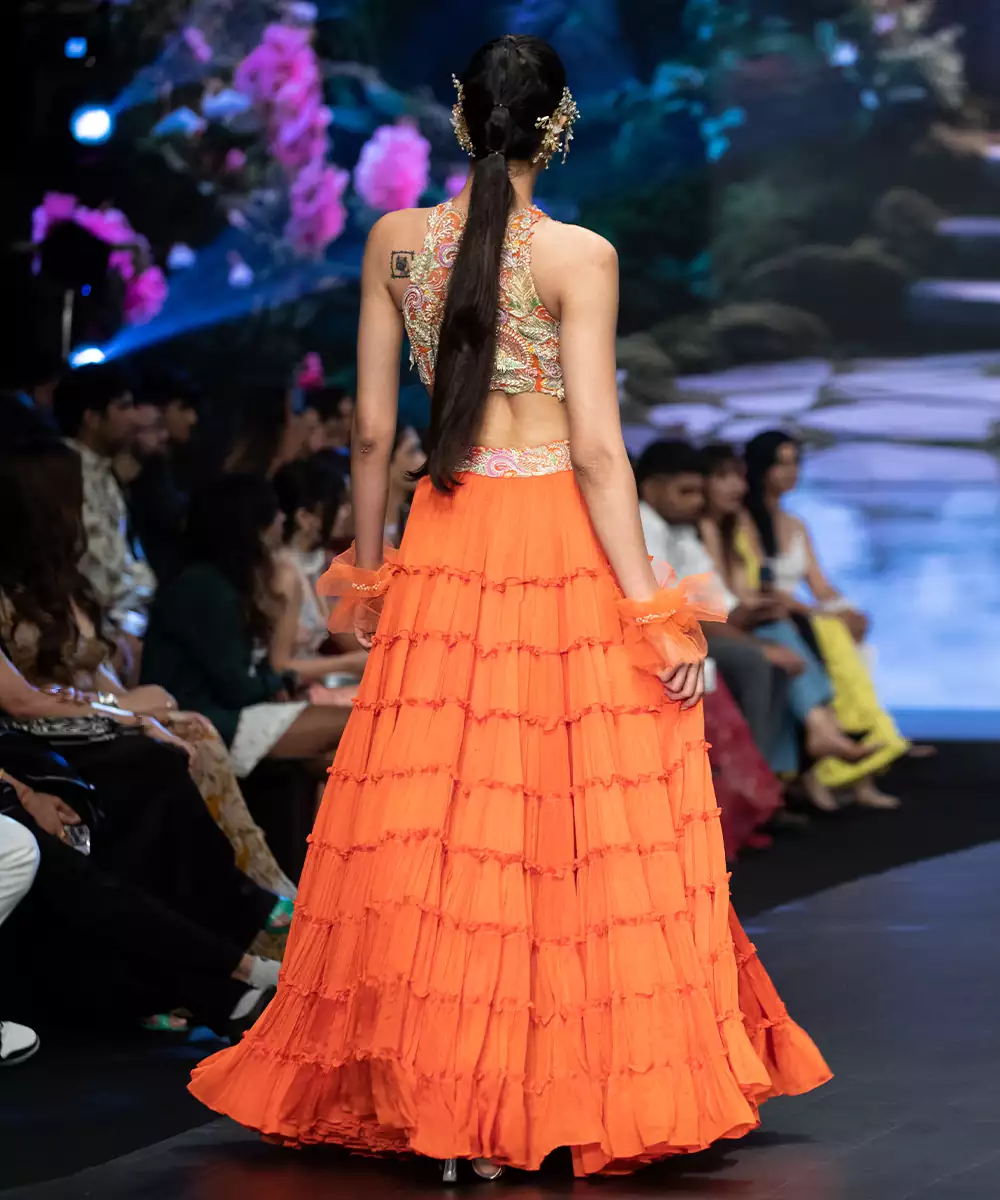 This Orange Embroidered Silk Lehenga Radiates Vibrant Elegance With Its Rich Silk Texture And Intricate Traditional Motifs. Detailed Thread And Zari Embroidery Enhance Its Festive Appeal, While The Graceful Flare Adds Movement And Charm, Making It A Perfect Choice For Weddings, Celebrations, And Grand Festive Occasions.