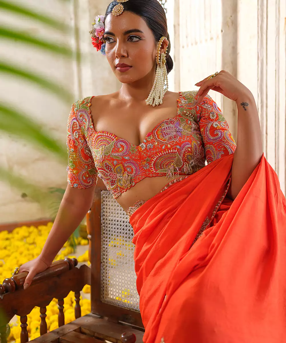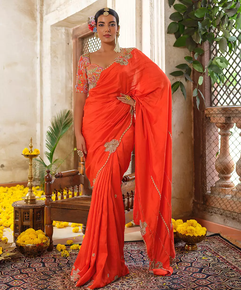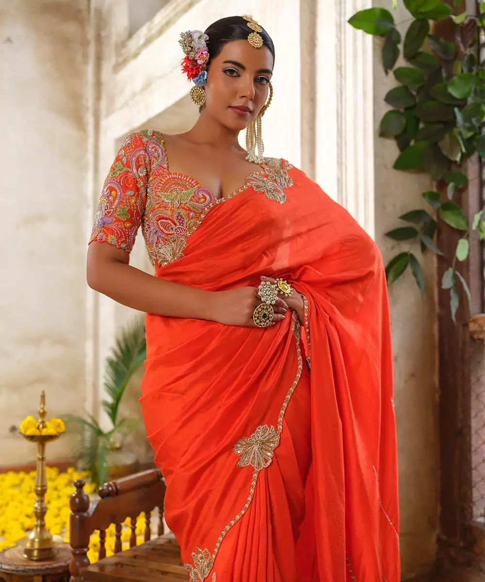 Vibrant Orange Embroidered Silk Saree Crafted In A Rich, Lustrous Fabric With A Graceful Drape. Intricate Embroidery Enhances Its Festive Charm And Traditional Elegance, Creating A Refined Silhouette. Perfect For Weddings, Festive Celebrations, Parties, And Special Occasions That Call For Timeless Style.