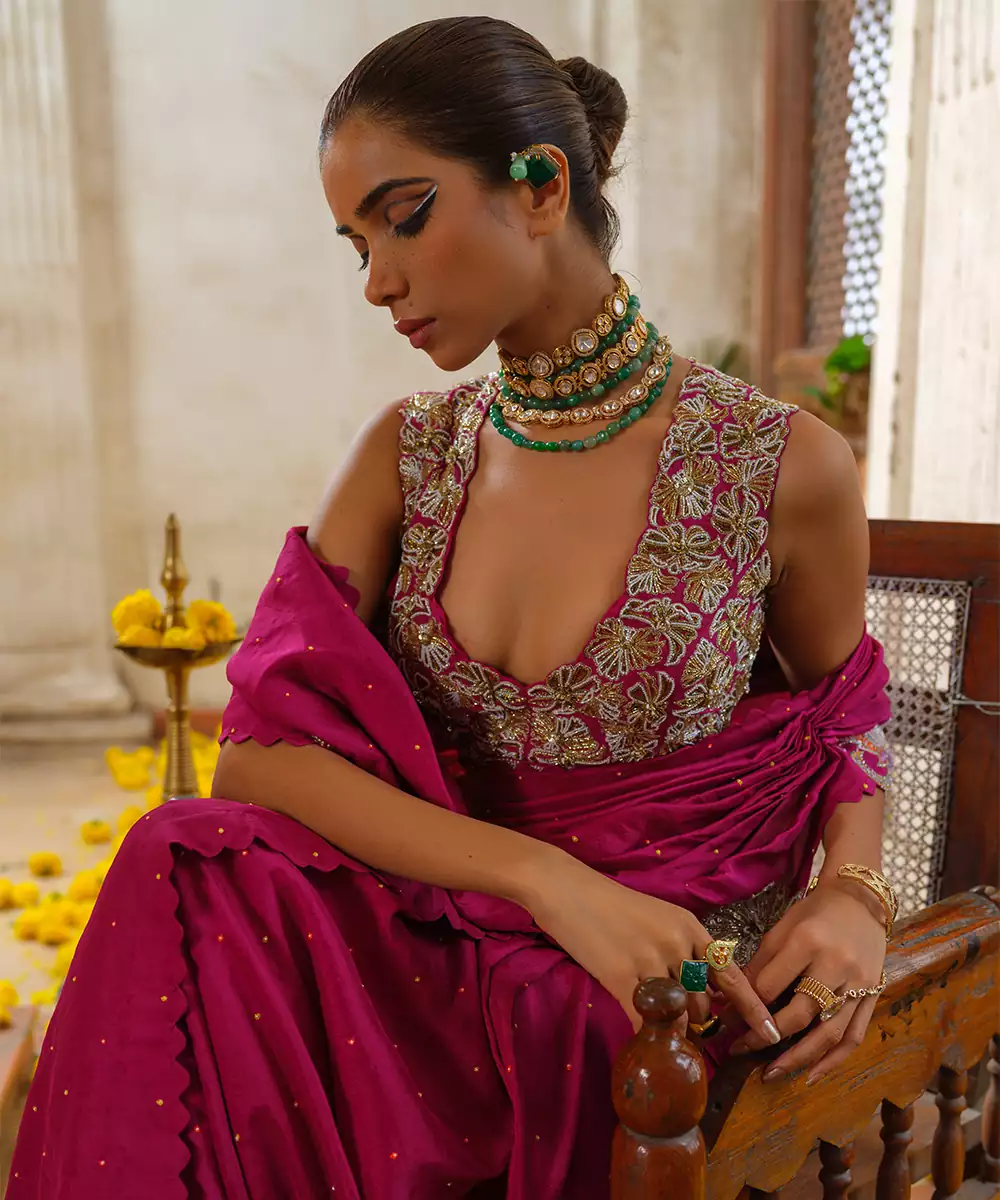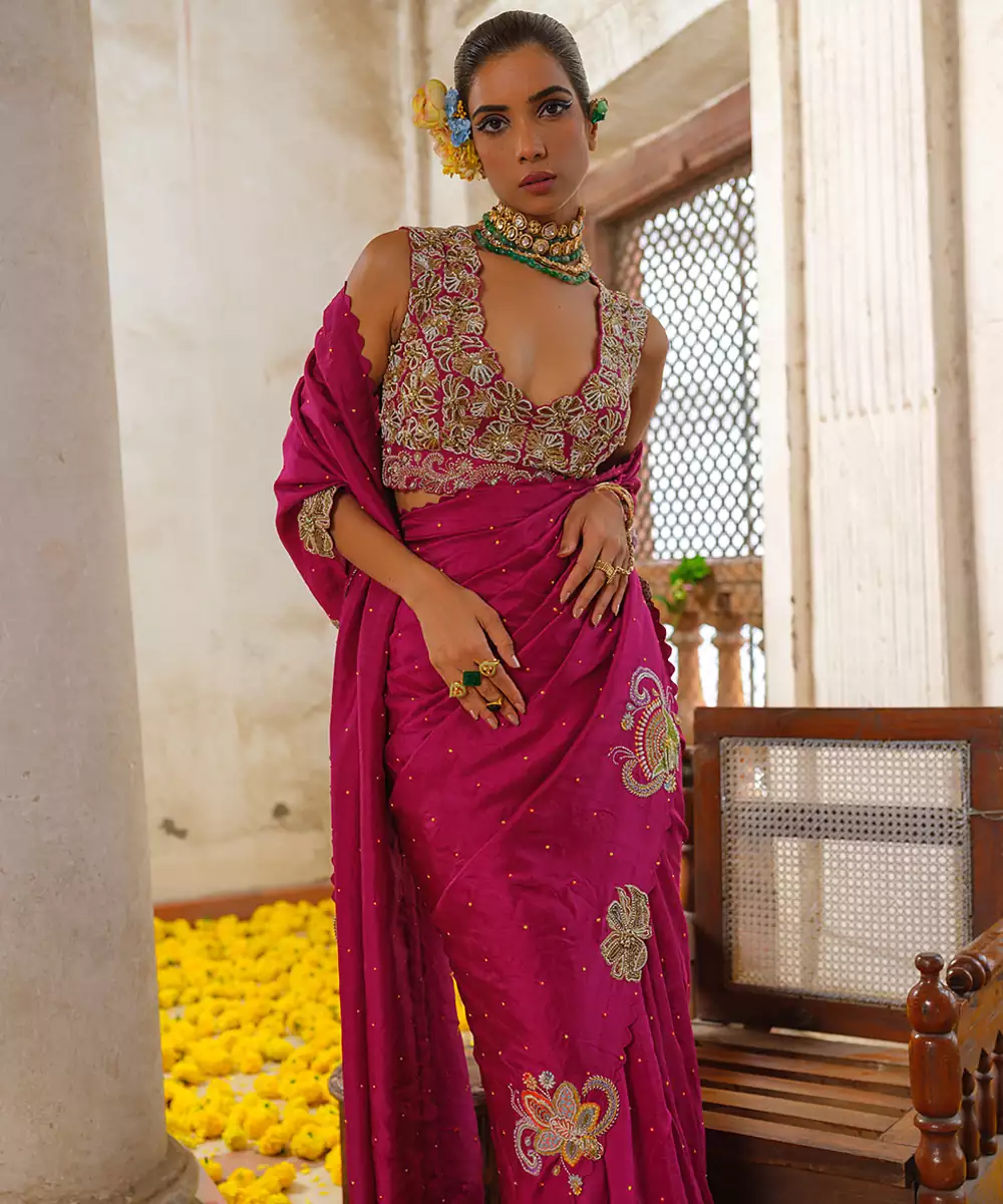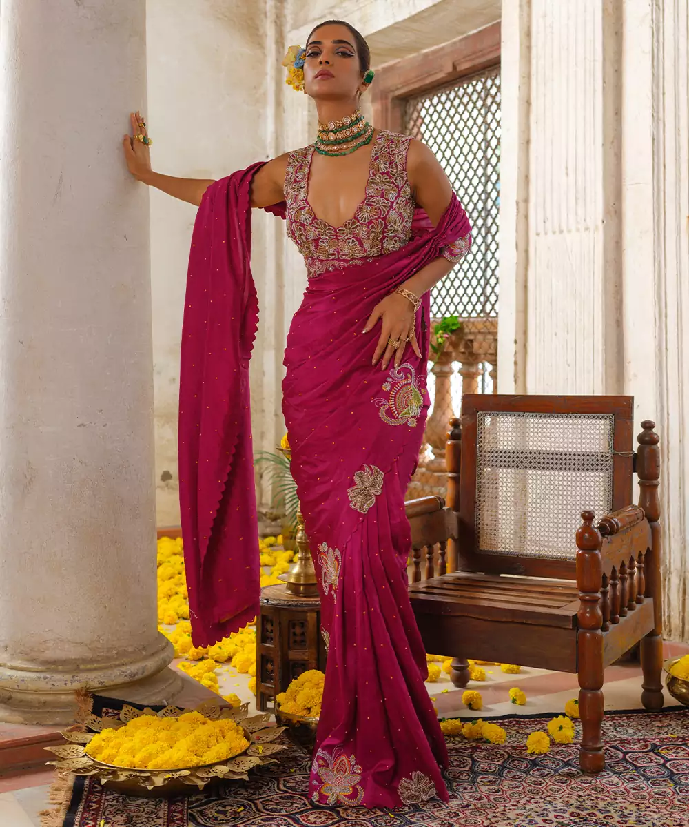 Elegant Pink Embroidered Silk Saree Crafted In A Rich, Lustrous Fabric With A Smooth And Graceful Drape. Intricate Embroidery Adds Festive Charm And Refined Detailing, Enhancing Its Timeless Appeal. Perfect For Weddings, Festive Celebrations, Parties, And Traditional Occasions That Call For Sophistication And Style.